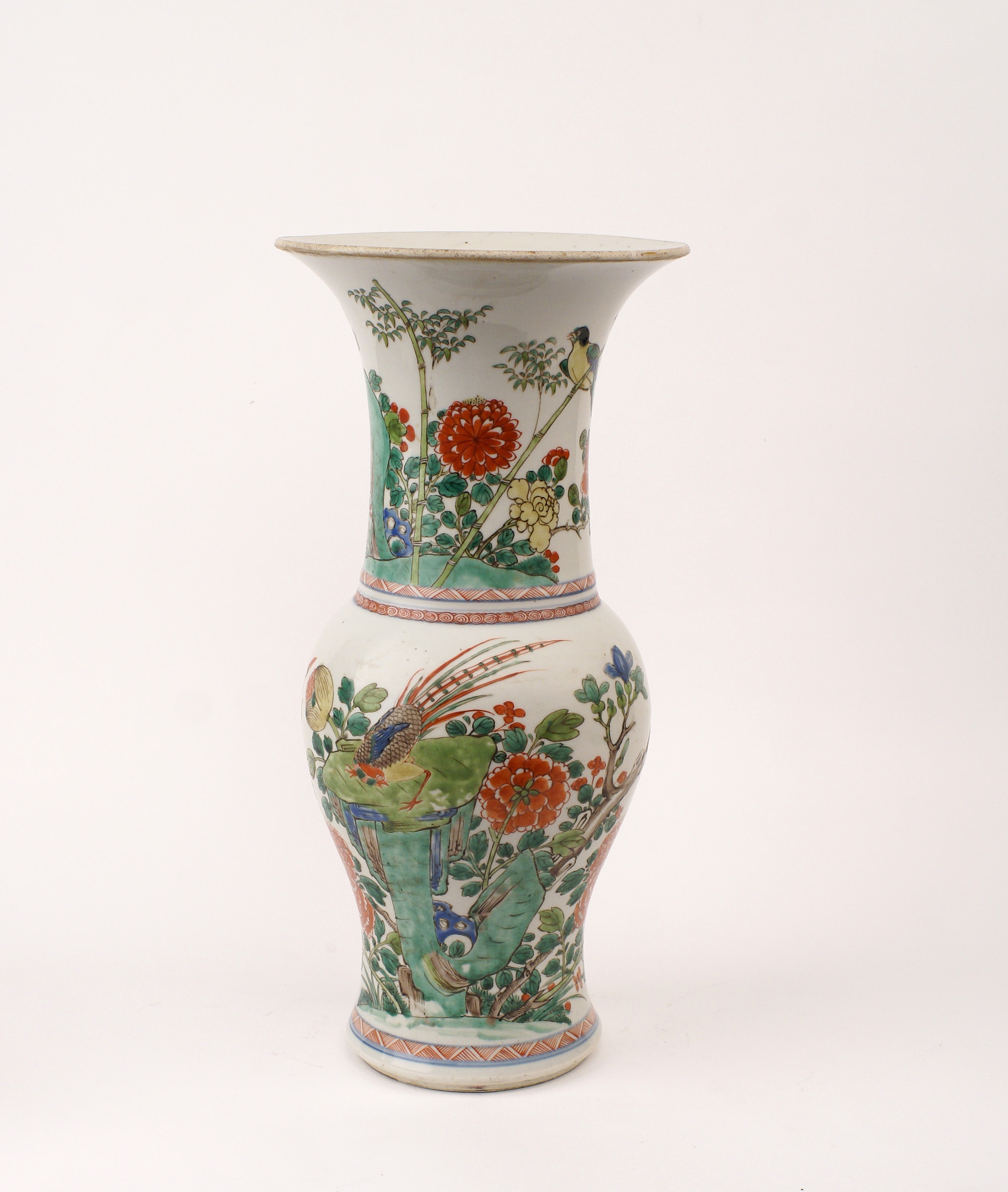 VASO A BALAUSTRO IN CERAMICA SMALTATA Cina XIX Sec. dipinto in policromia e decorato a motivi floreali e di volatili su fondo bianco h. 43,5 cm.
