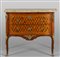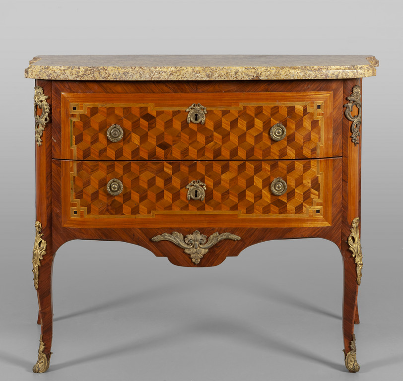 Cassettone intarsiato in legni vari, marquetteria a cubi, due cassetti, piano in marmo, stampigliato Fromageau, sec.XVIII