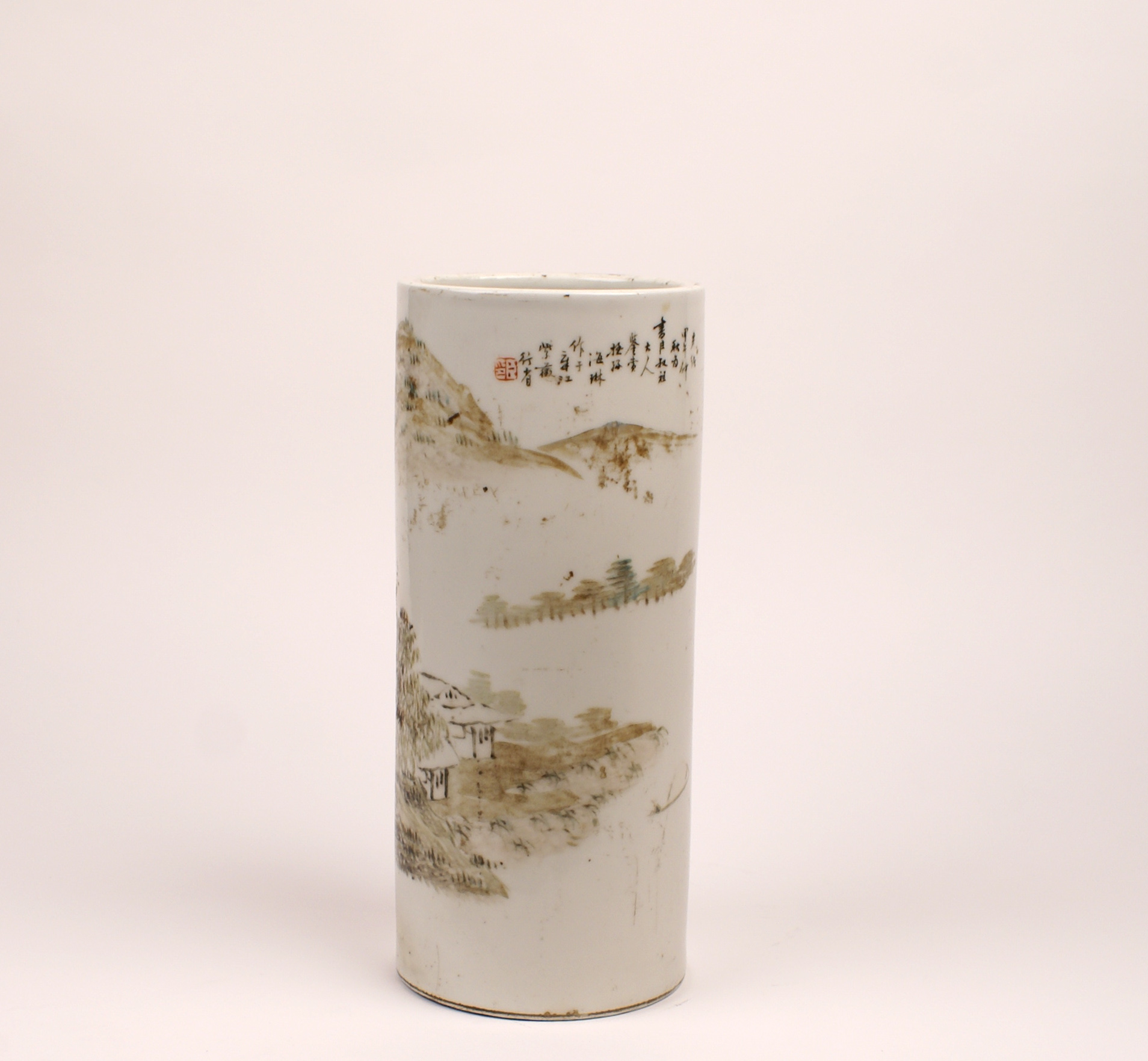 VASO IN PORCELLANA DI FORMA CILINDRICA Cina XIX Sec. dipinto in policromia e decorato a motivo di paesaggio h. 29 cm.