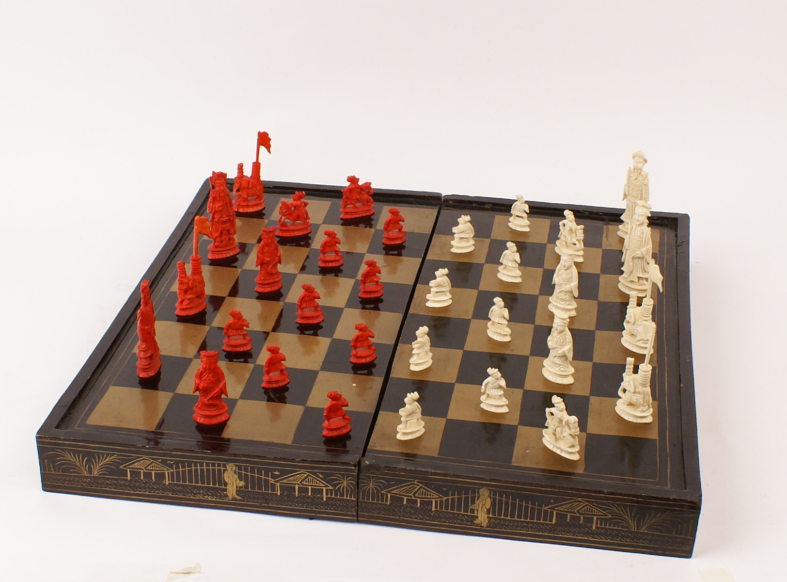 ANTICA SCACCHIERA Cina con pezzi in avorio e base in legno laccato e dorato