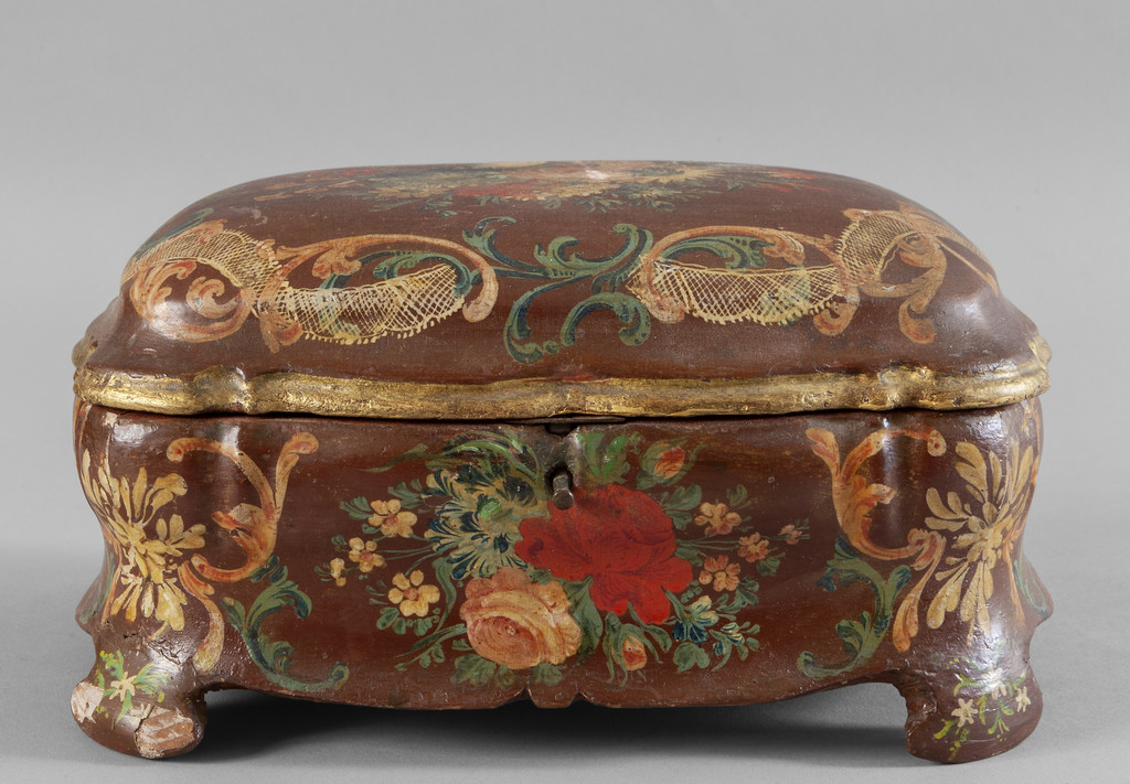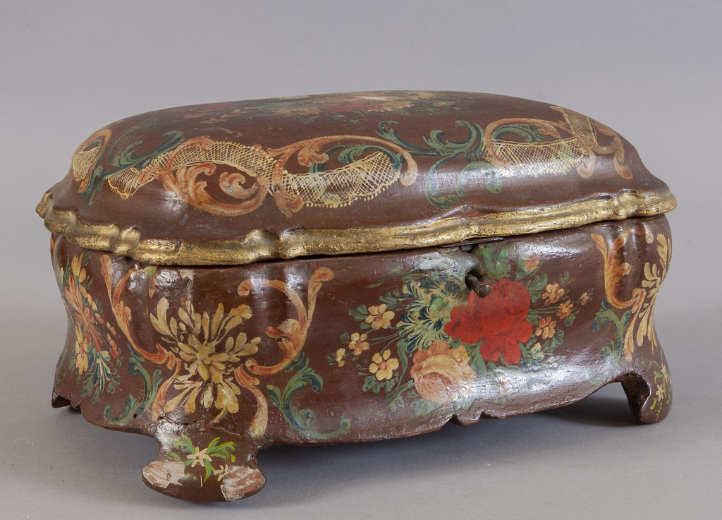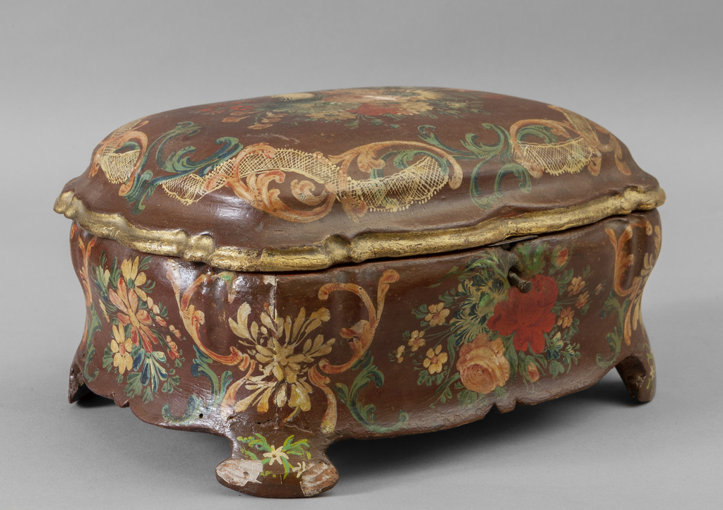 Scatola Luigi XV in legno finemente intagliato e laccato a motivi floreali, Venezia sec.XVIII