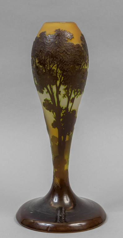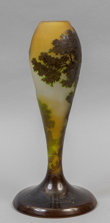 Base di lampada in vetro lavorato all'acido a paesaggi nei toni del verde e del marrone, f.ta Gallè, Francia inizi sec.XX (sbeccature al collo)