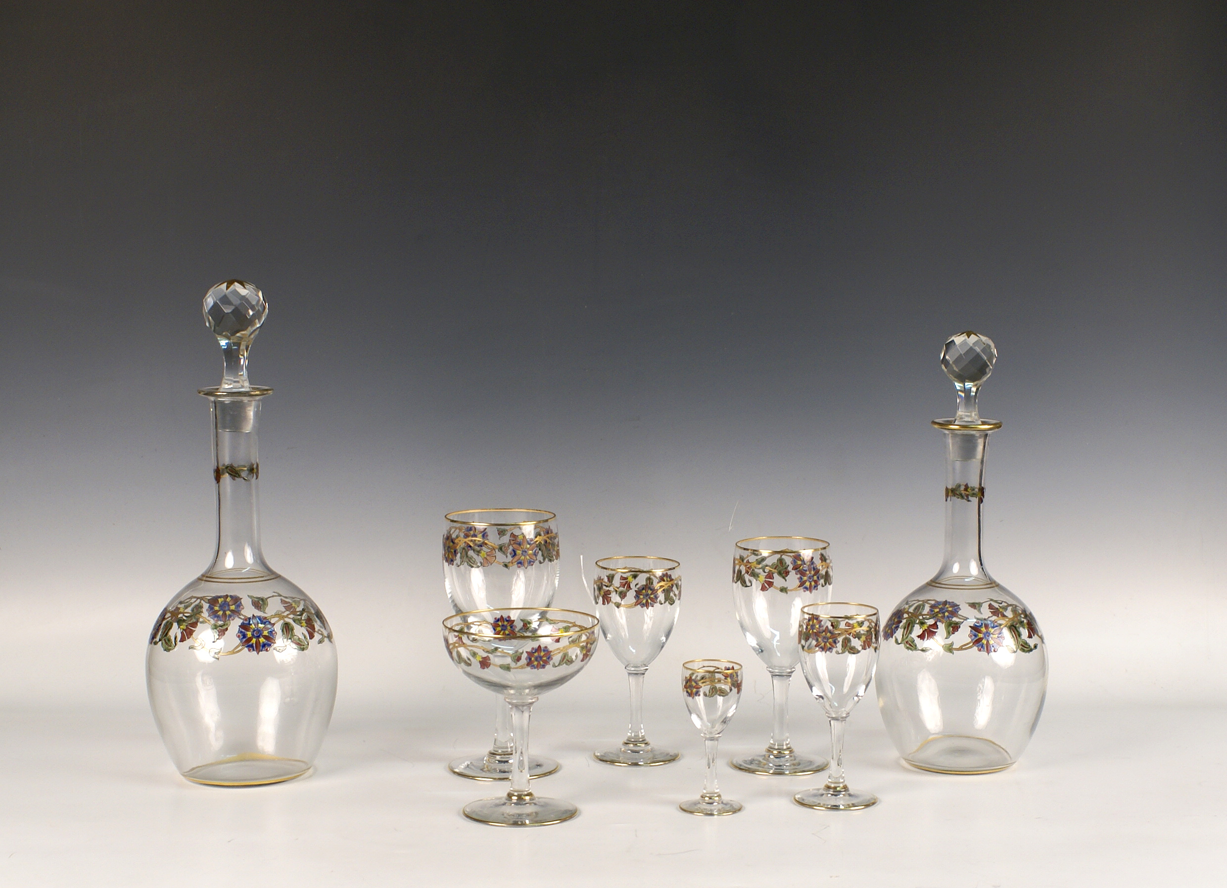 SERVIZIO BICCHIERI IN VETRO DIPINTO decorato a motivi floreali e profilati in oro, composto da 6 bicchieri acqua, 6 bicchieri vino bianco, 6 bicchieri vino rosso, 6 coppe champagne, 6 bicchieri da liquore, 6 bicchieri da rosolio e 2 bottiglie con relativi piatti