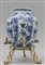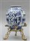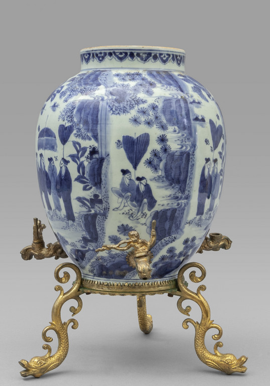 Vaso in porcellana, decorazione bianca e blu con personaggi, Cina epoca Kang Xi, ricca montatura in bronzo dorato con piedini a forma di delfini, sec.XIX