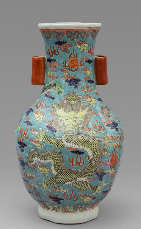 Vaso in porcellana di forma polilobata decorato su fondo turchese con drago a 5 unghie e perla, sec. XIX