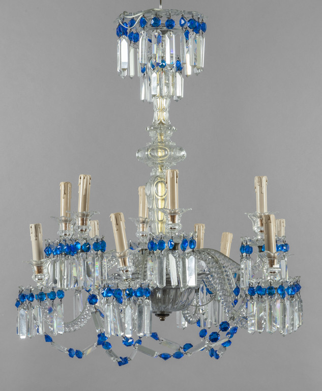Lampadario a dodici luci in cristallo bianco e cristalli blu, inizi sec.XX