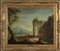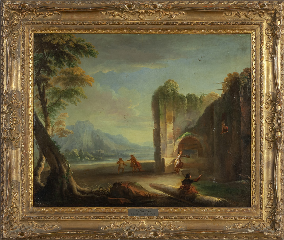 "Paesaggio con viandanti e rovina classica" olio, sec.XVIII