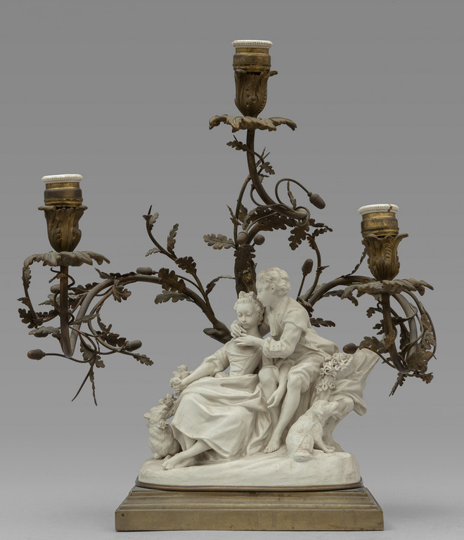 Innamorati, gruppo in biscuit montato a lampada, inizi sec.XX
