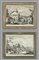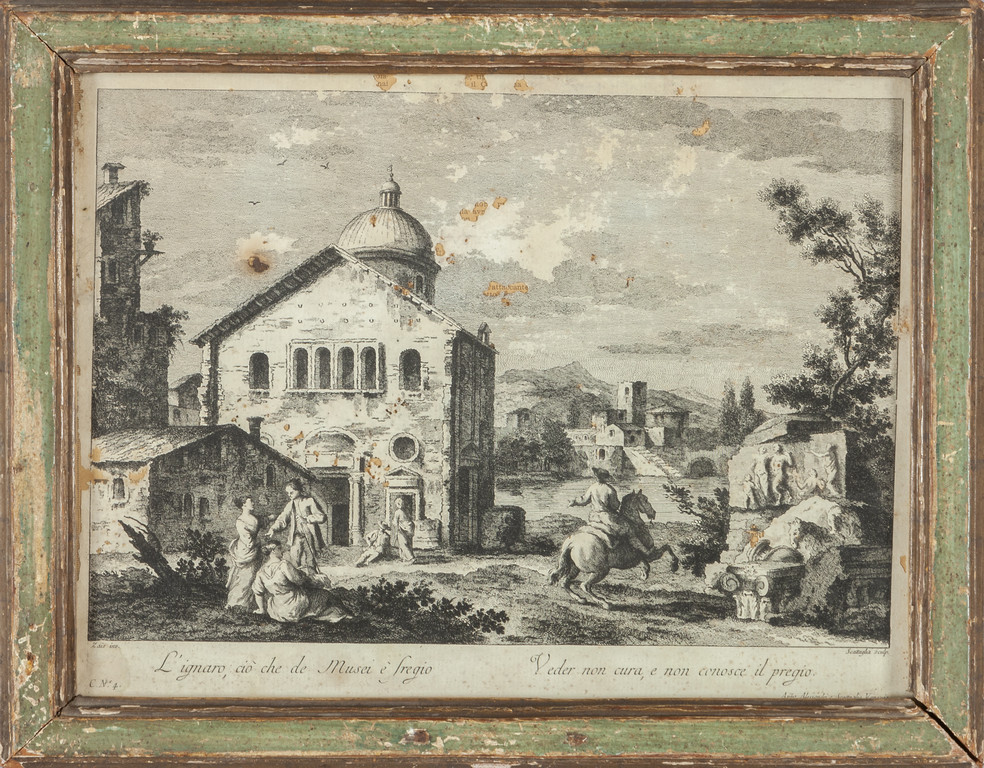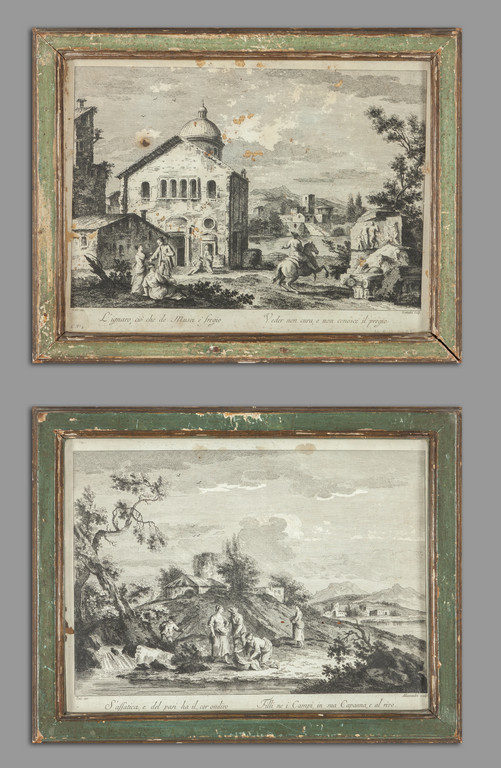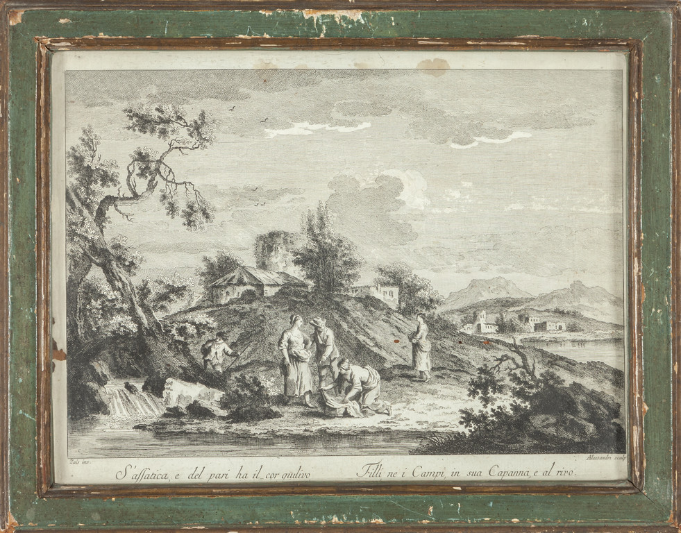 "Paesaggio con personaggi" coppia di antiche stampe da Zais, cornici laccate a fondo verde