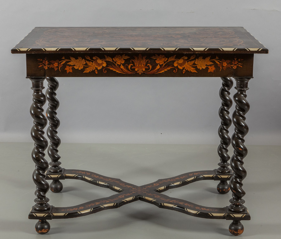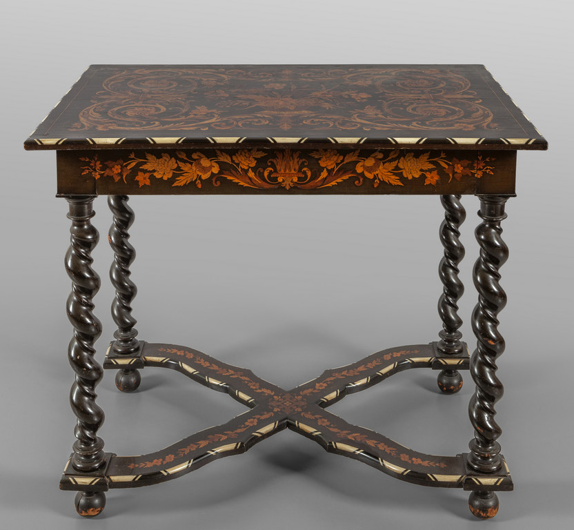 Tavolo in stile Luigi XIV finemente intarsiato in