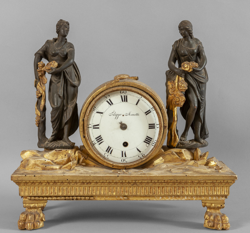 Orologio in legno finemente intagliato, la macchina, f.ta Filippo Manetti, è inserita in una botte contornata da due figure in legno ebanizzato poggianti su una base a finta roccia (mancanze e difetti)