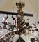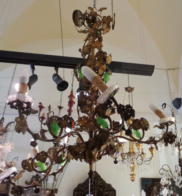 Lampadario a sei luci in metallo dorato, decorato a tralci d'uva con grappoli in vetro verde, sec.XIX