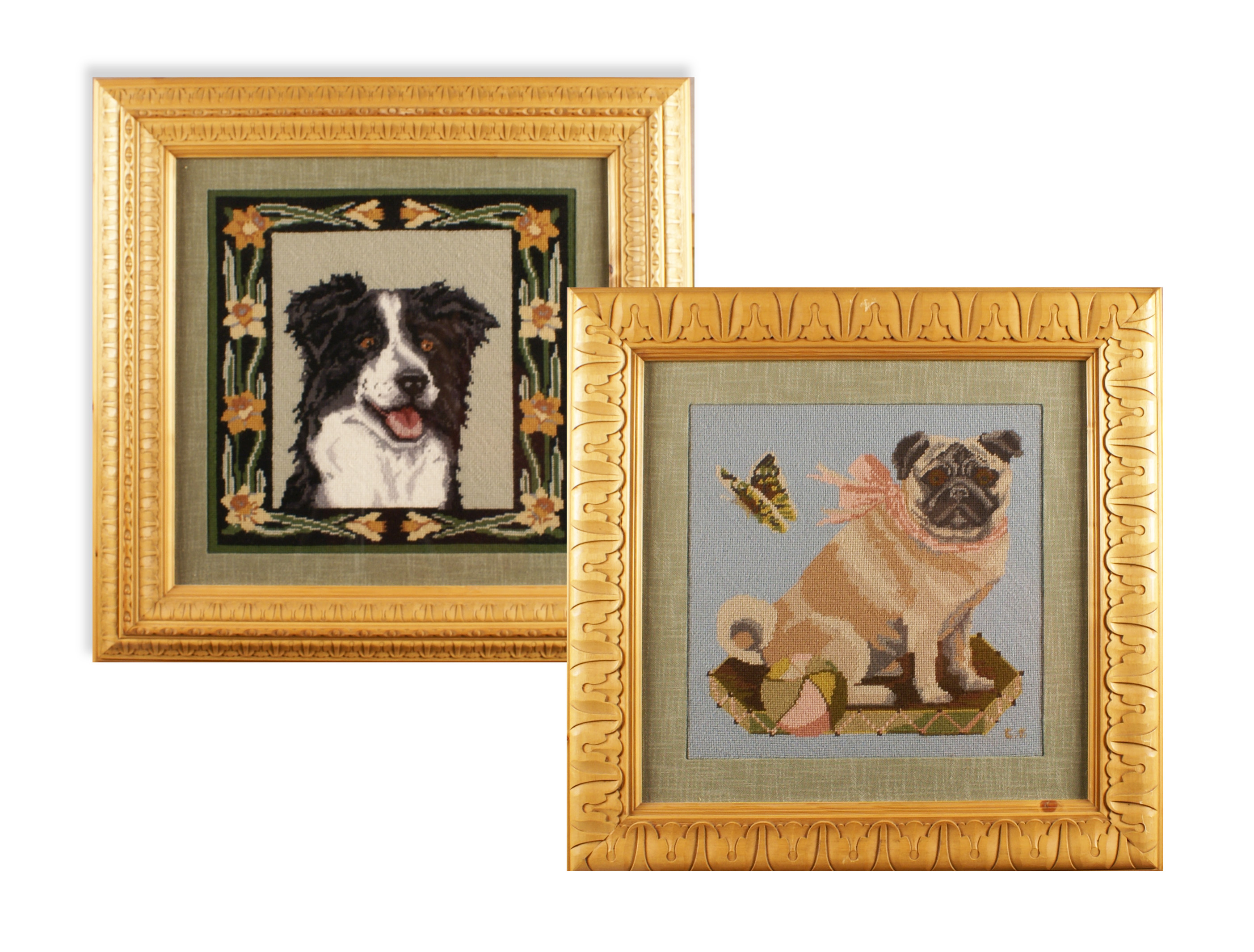 COPPIA DI RICAMI A PICCOLI PUNTO raffiguranti ritratti di cani entro cornici in abete 66x66 cm.