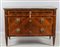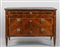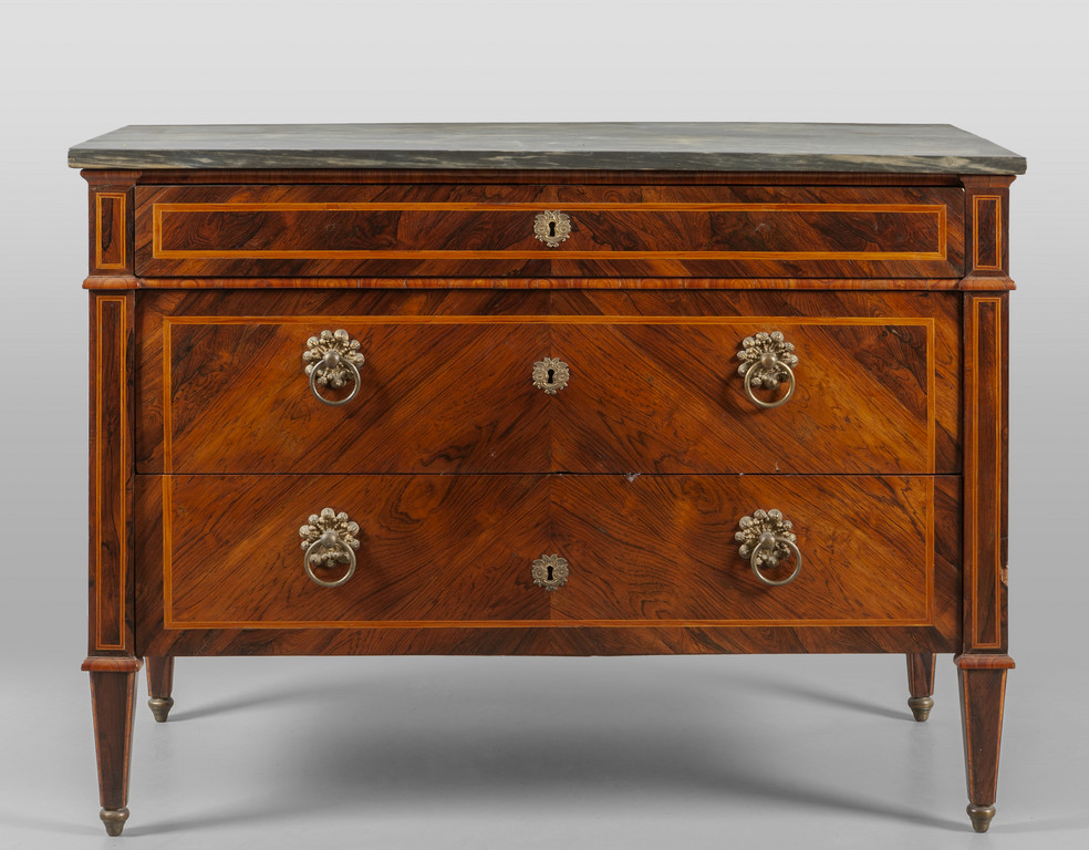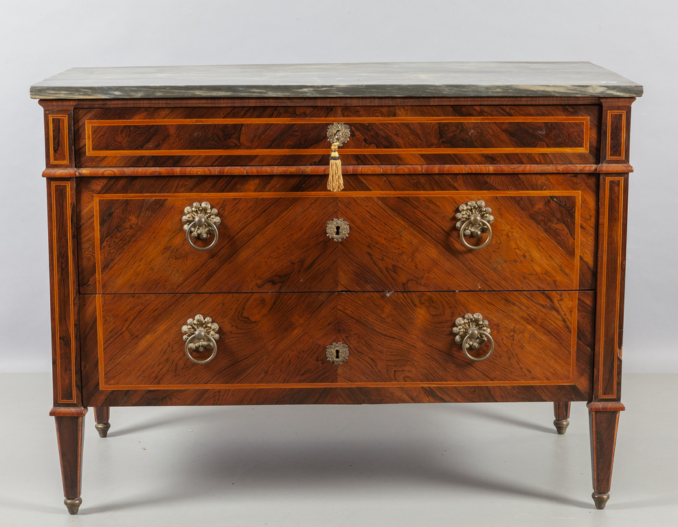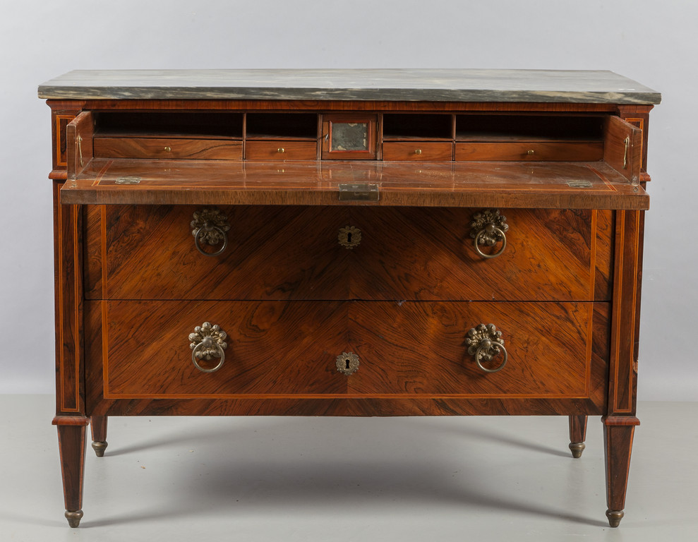 Comò Luigi XVI a due cassetti più uno celante scrittoio con cassettini, lastronato in palissandro e filettato in bois de rose, piano in marmo bardiglio, Genova II metà sec.XVIII