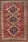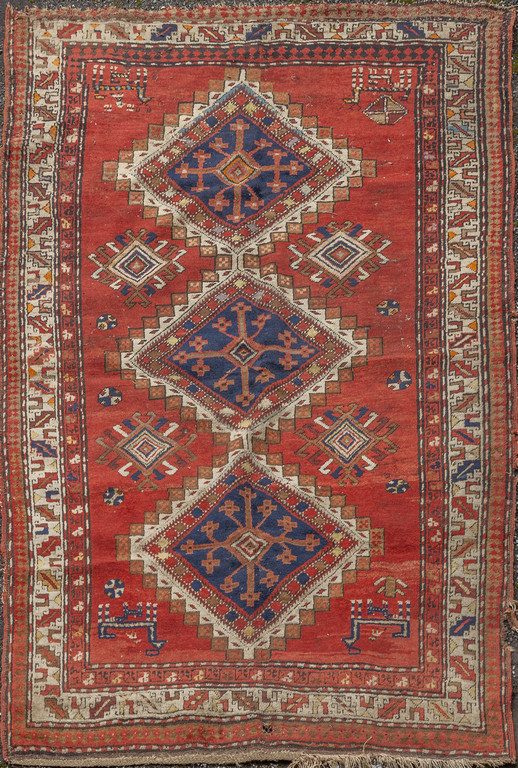 Tappeto caucasico decorato con tre rombi centrali su fondo rosso (difetti)