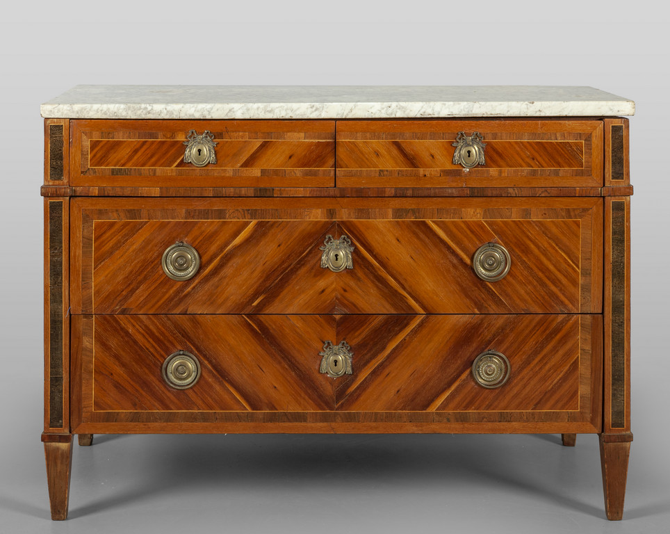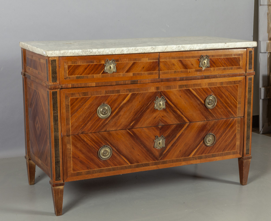 Comò Luigi XVI lastronato in noce d'India e filettato in acero e palissandro, due cassetti grandi e due piccoli, piano in breccia, Genova II metà sec.XVIII