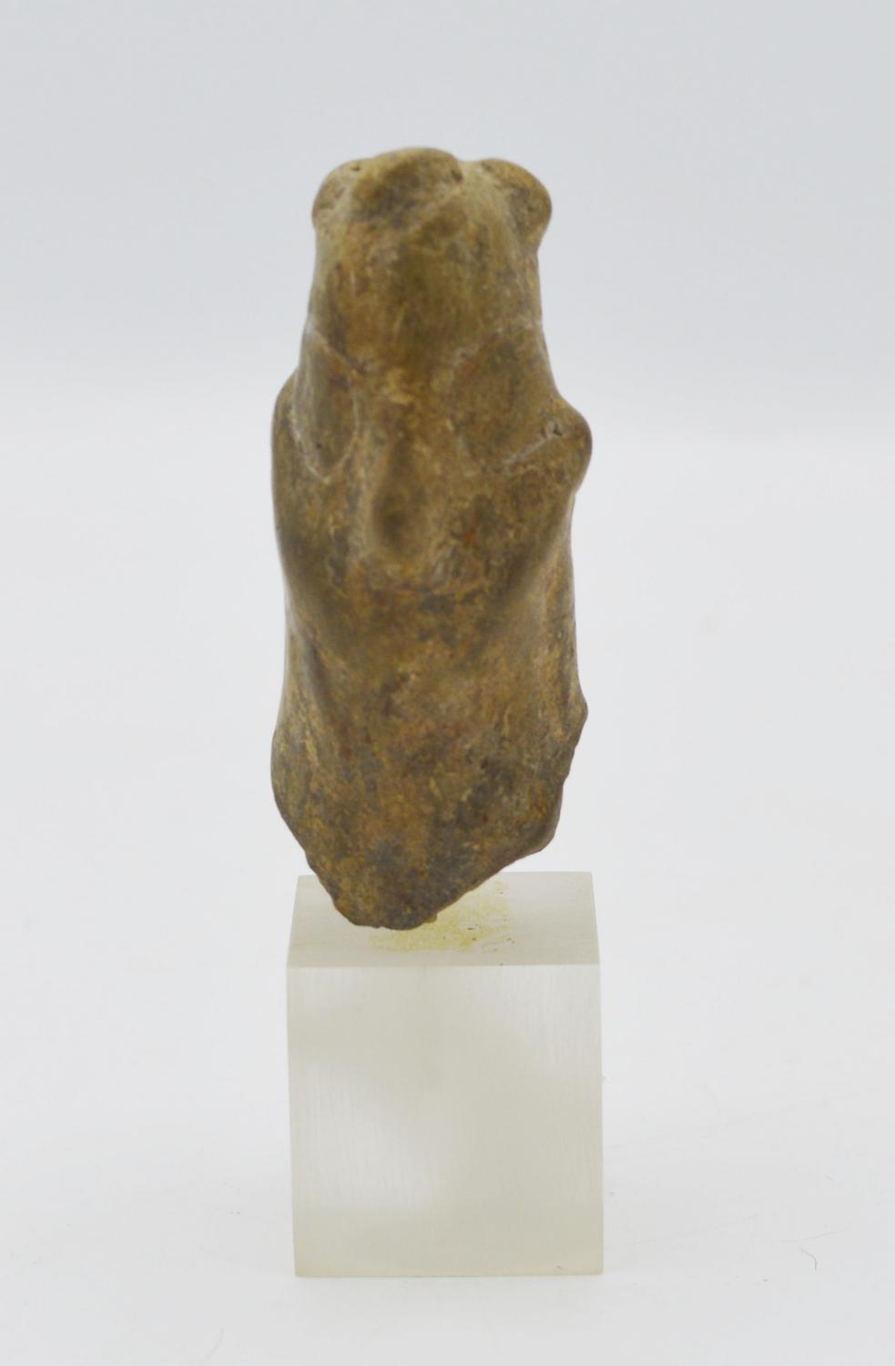 Testina di figurina femminile in argilla, fortemente stilizzata, con naso aquilino, rappresentante la dea madre.