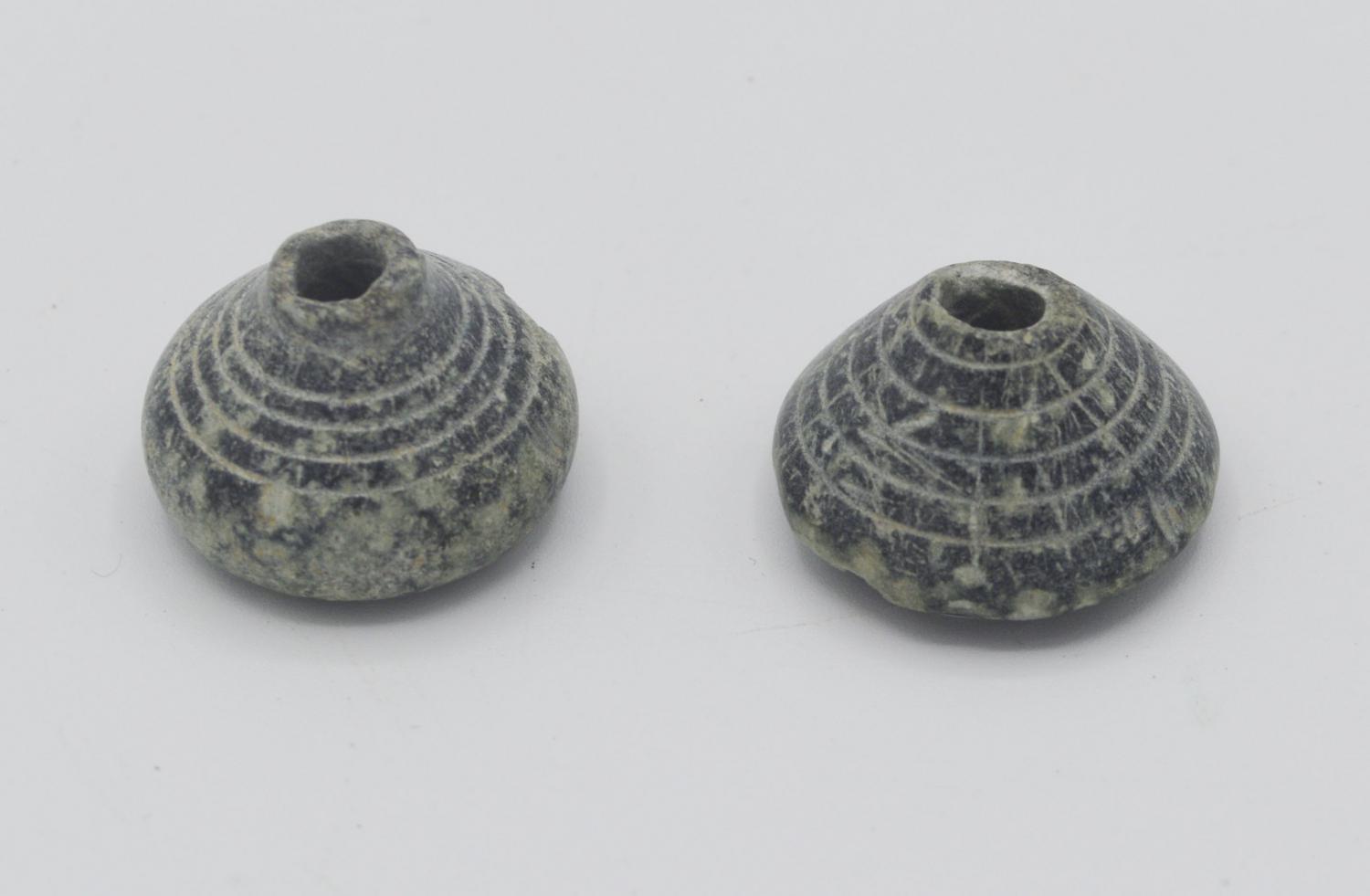 Vaghi di collana in steatite, di forma conica, decorati con una serie di incisioni anulari orizzontali. Foro passante bipolare. (2)