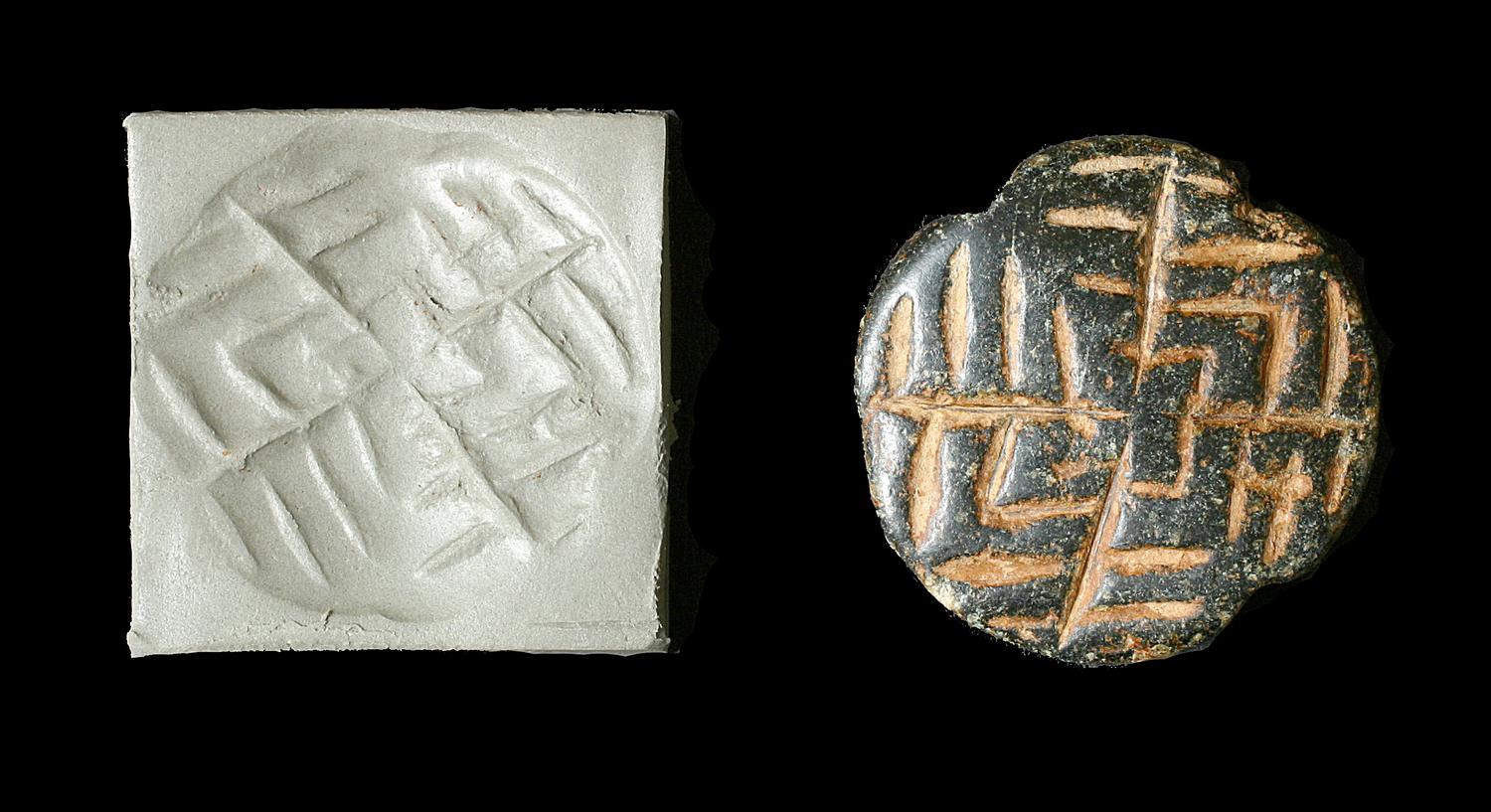 Sigillo steatite nera lenticolare con foro passante l'incisione presenta un segno a X con chevrons nei quattro settori; l'immagine pare rinviare a una tela di ragno.