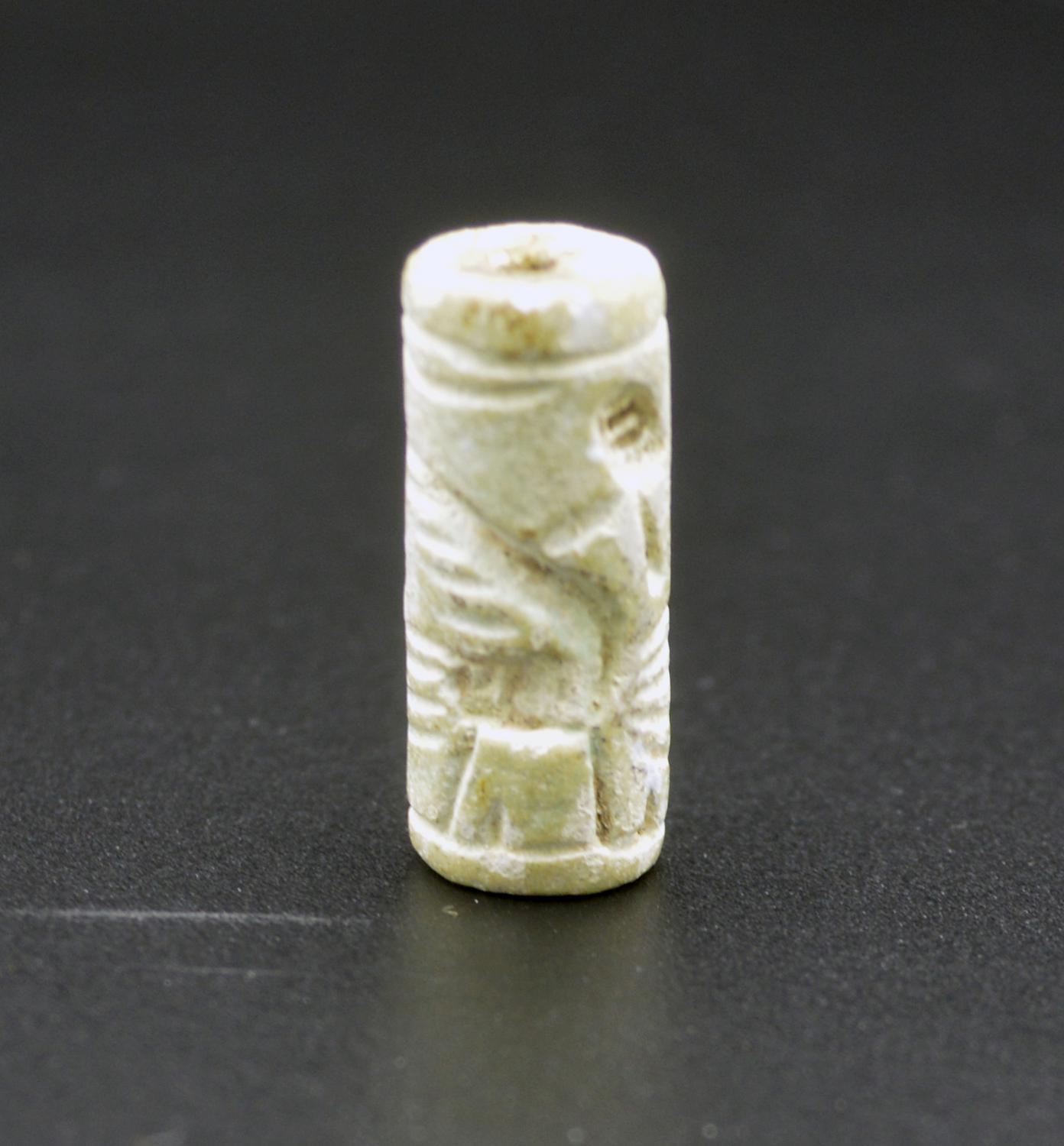 Sigillo cilindrico in faience con grifone con testa rivolta all'indietro e sfinge maschile alata.