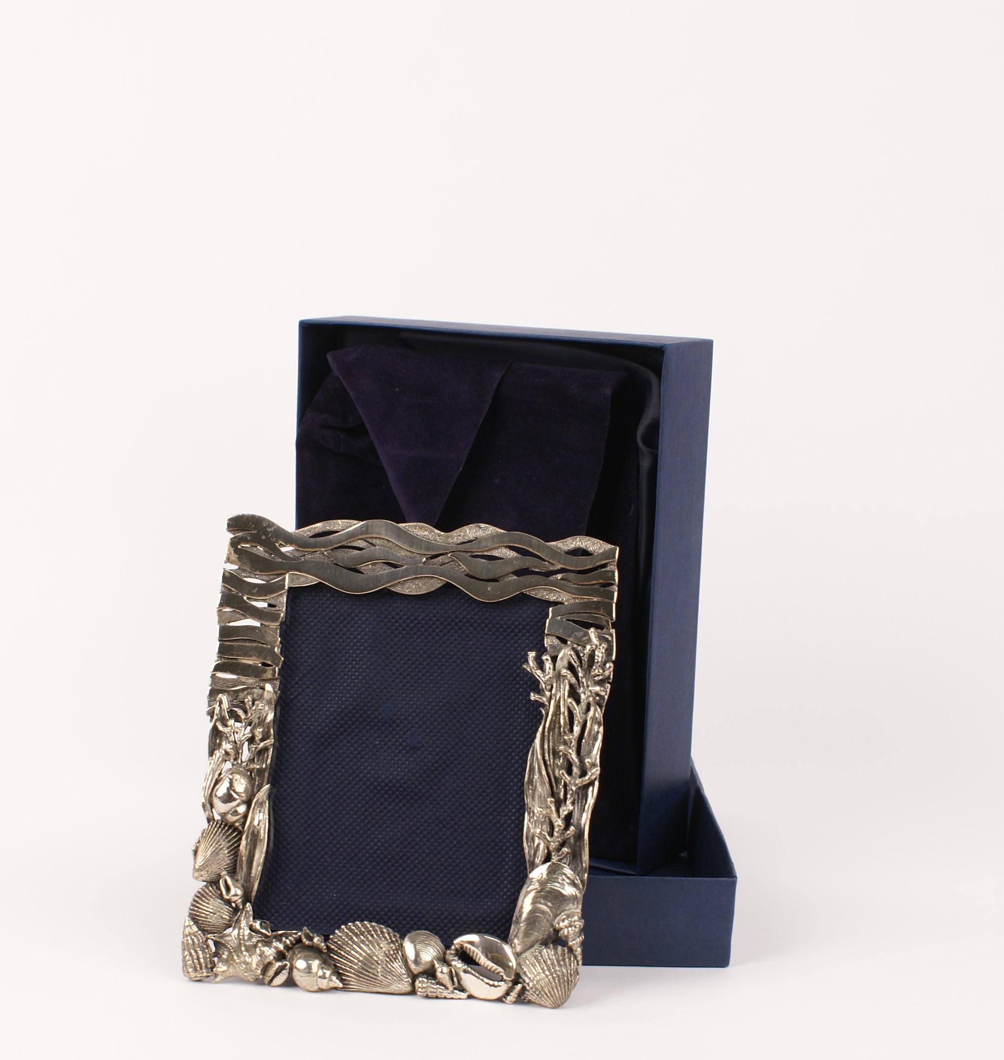 PICCOLA CORNICE IN ARGENTO manifattura italiana decorata a motivi di conchiglie, cm.15x13 183 gr.