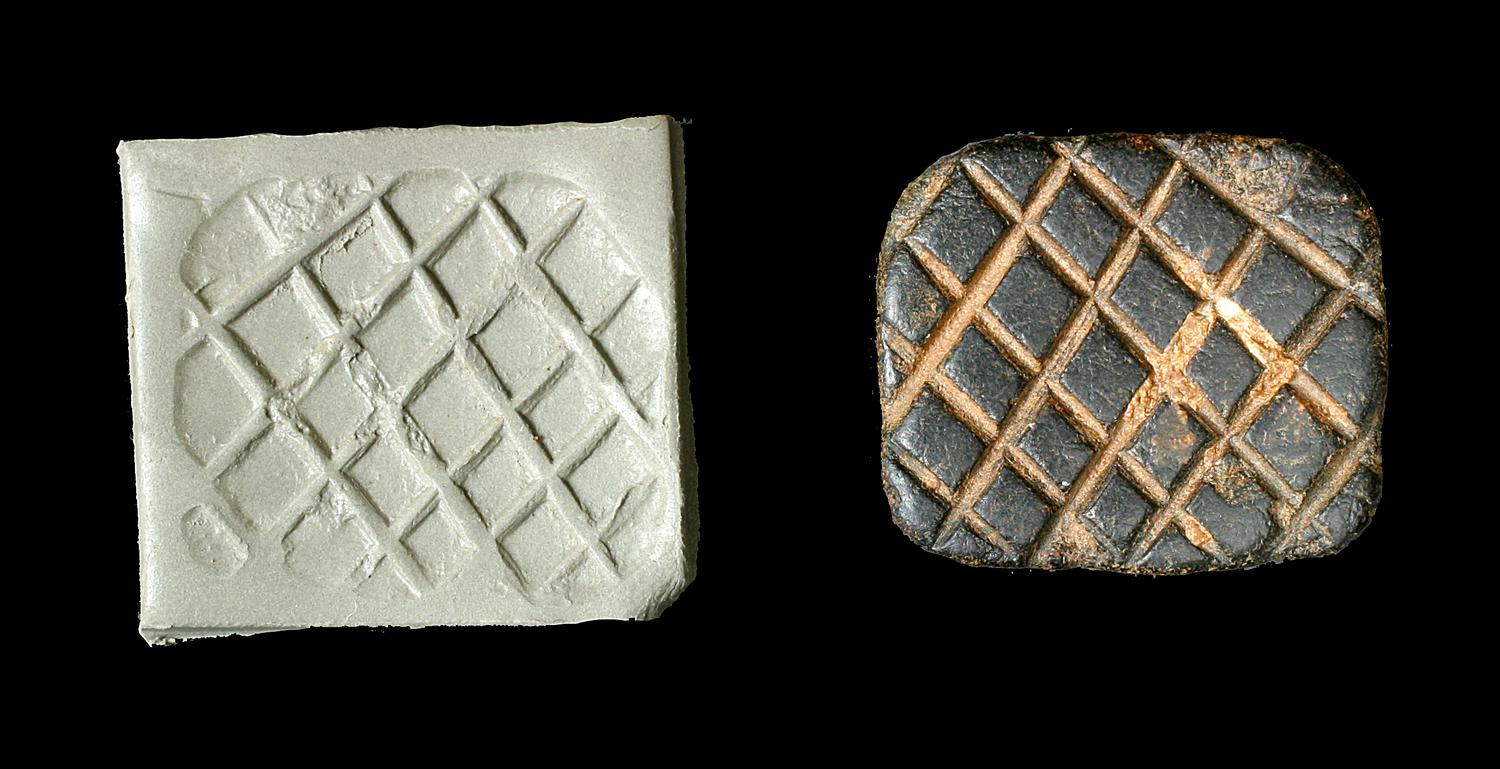 Sigillo con piano stampante sub- rettangolare con presa rilevata e foro passante; incisione a graticcio incrociato.