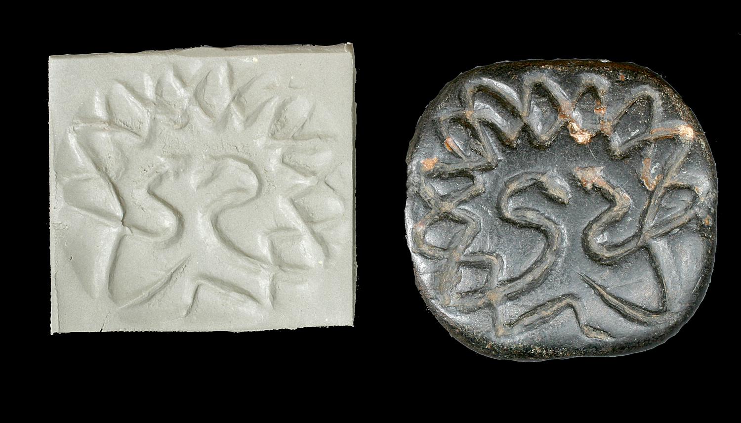 Sigillo a stampo di forma ellittica con la raffigurazione di due serpenti che si avvolgono.