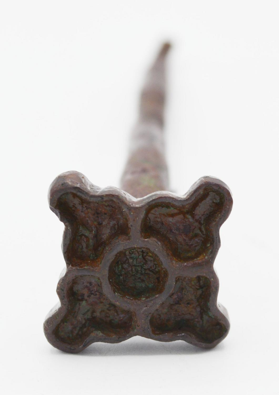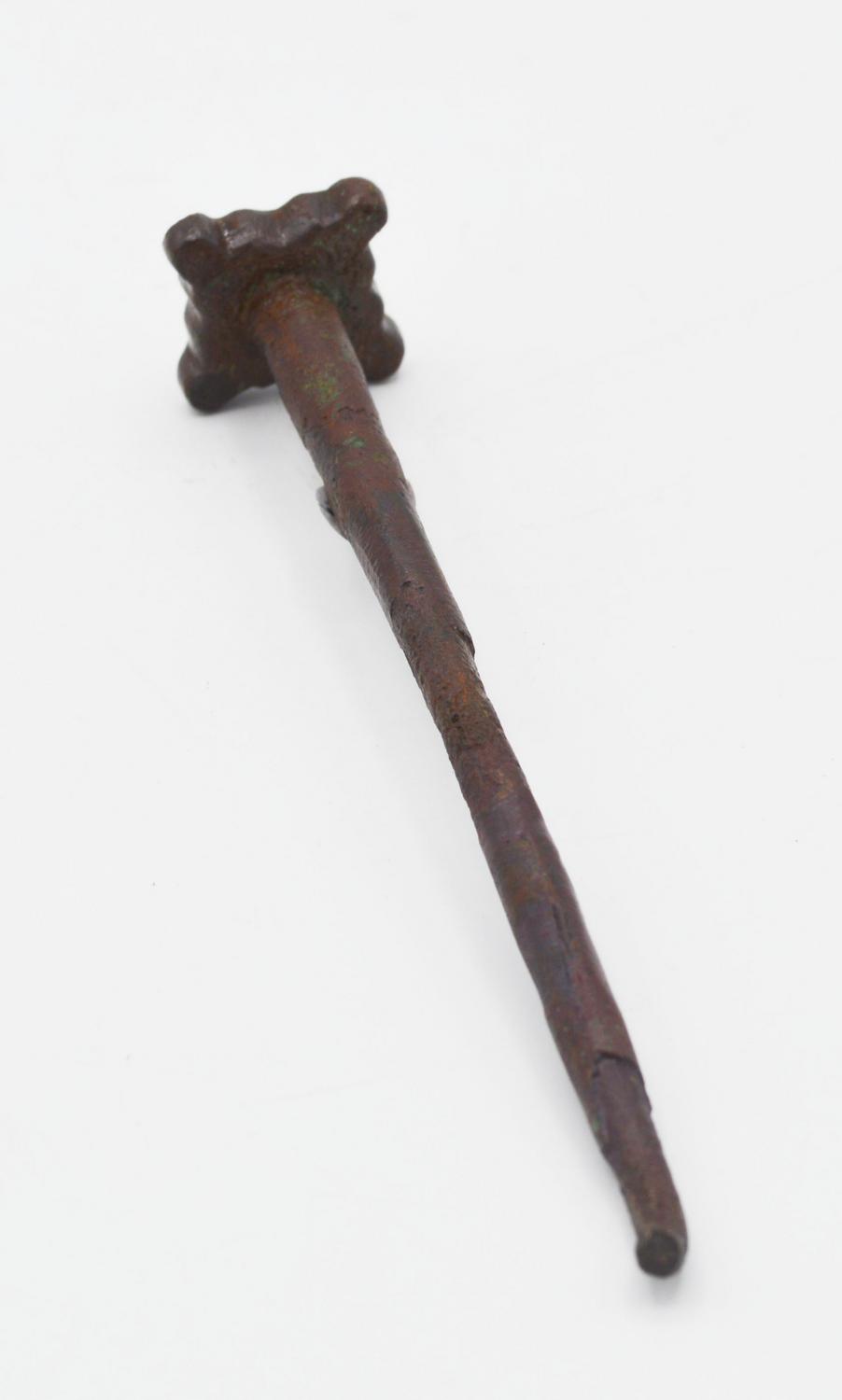 Grande spillone con capocchia modellata in forma di sigillo a stampo quadrangolare con motivo geometrico.