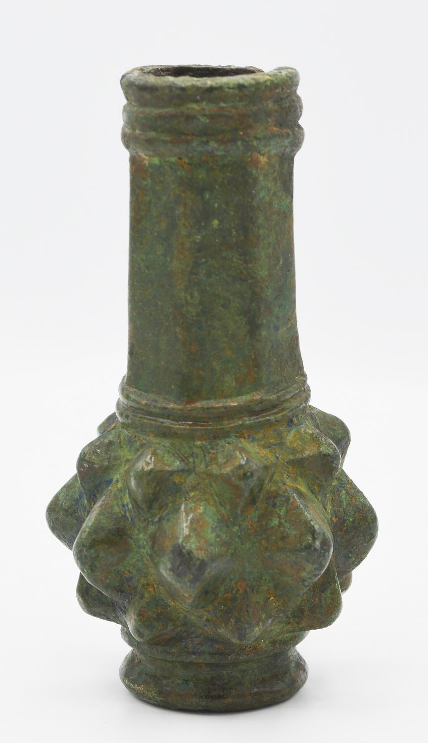 Testa di mazza quasi sferica con immanicatura a cannone e anelli in rilievo alle estremita' e parte superiore con prismi triangolari rilevati.
