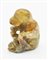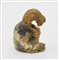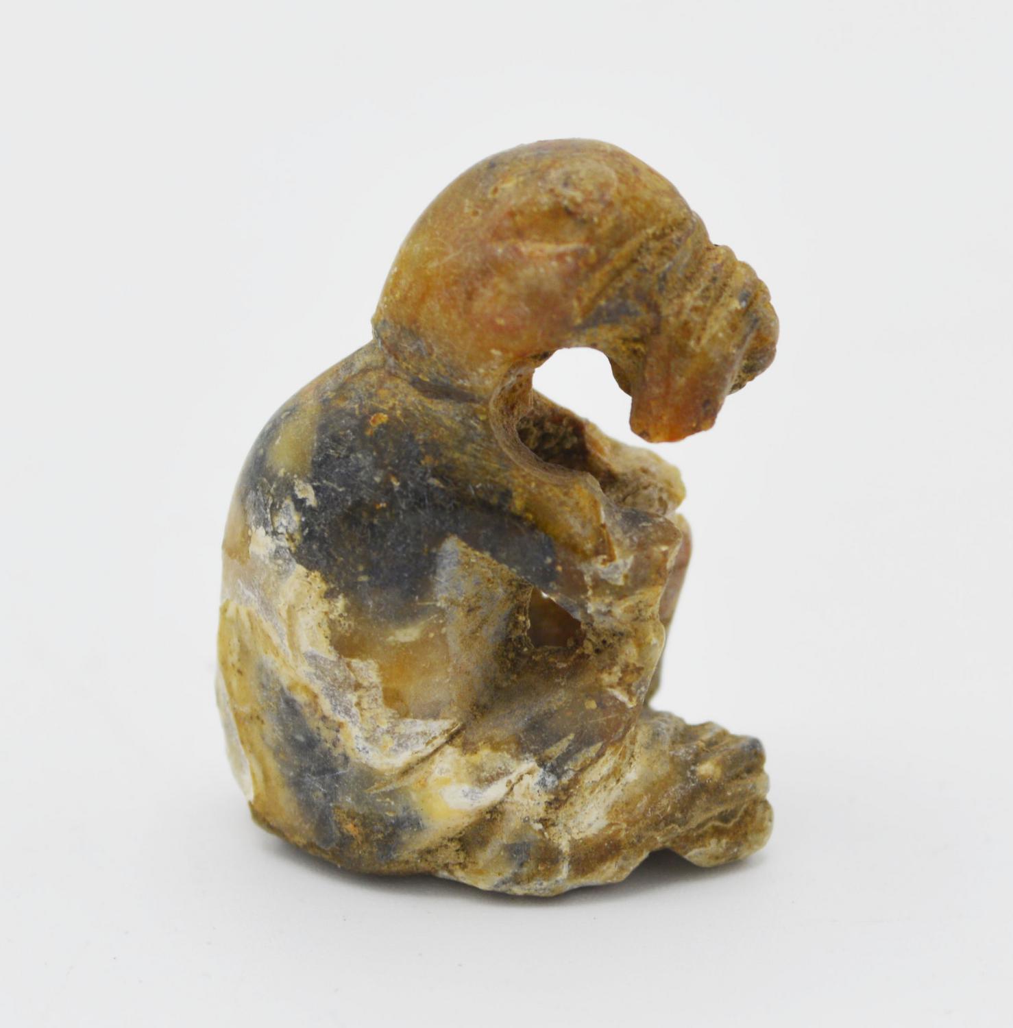 Piccolo ornamento zoomorfo in forma di scimmia accosciata con le zampe anteriori sul muso.