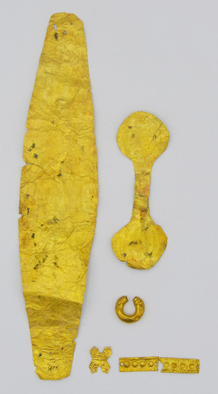 Corredo funebre aureo composto da sette elementi con diverse provenienze: la lamina centrale appartiene alla cultura ellenistica e si puo? datare intorno al III secolo a.C.; i paraocchi e i due serti frammentari sono considerati di produzione; un segno sema egiziano che raffigura polmoni e trachea; un orecchino ellenistico; un applique a croce di Sant'Andrea. (7)