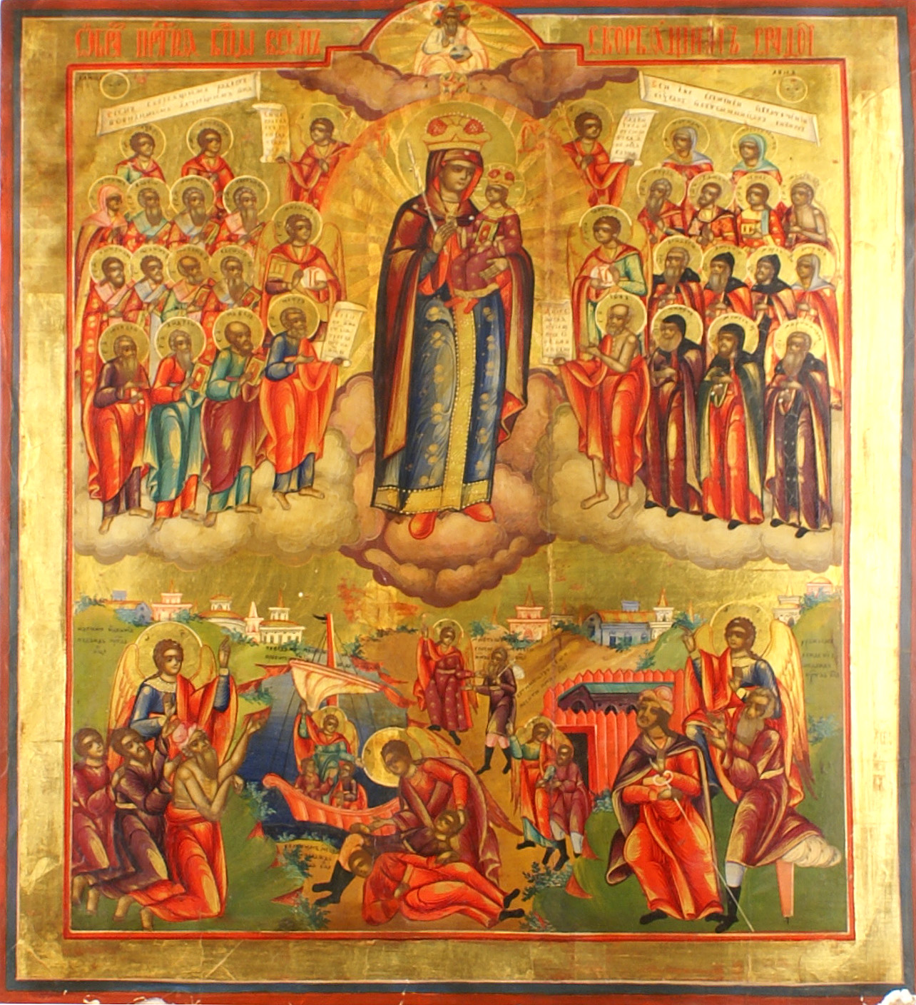 ICONA DIPINTA SU TAVOLA SU FONDO ORO Russia XIX Sec. "Incoronazione della Vergine con i Santi e gli Arcangeli" 53x46 cm.