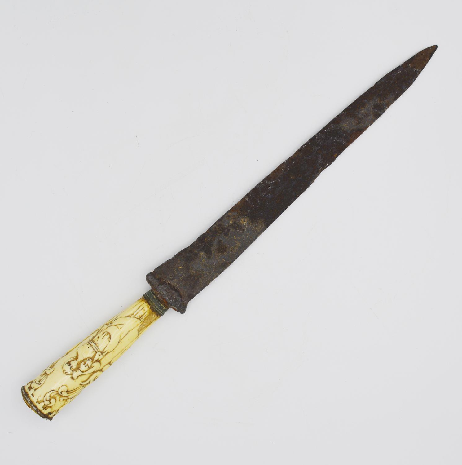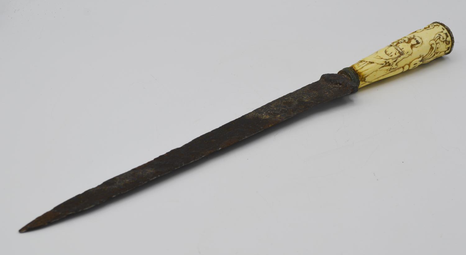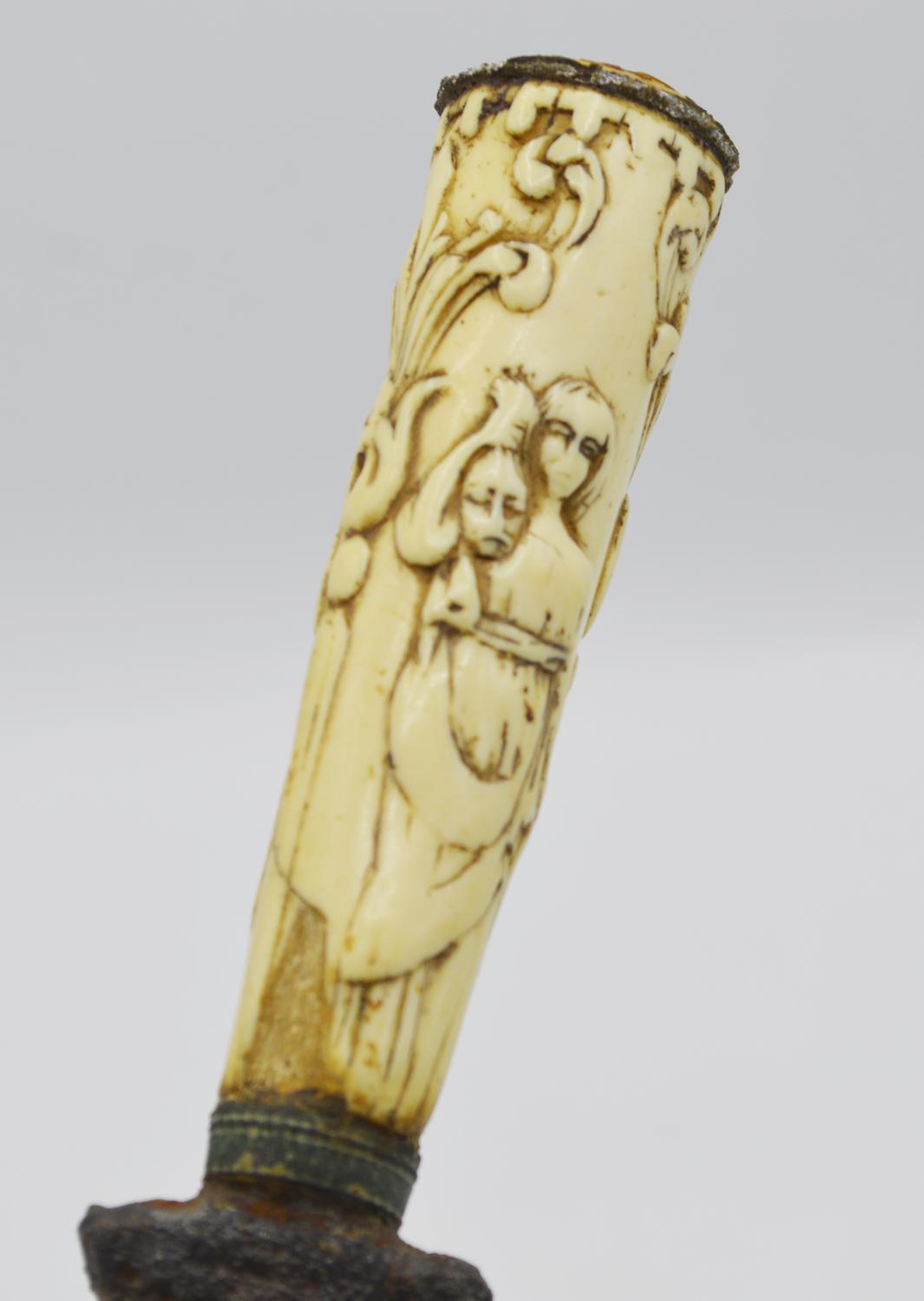 Elegante coltello in ferro con impugnatura in avorio incisa con figure