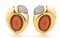 realizzati in oro giallo 18k, modello a lobo con clips, incastonati con cabochon di corallo Cerasuolo (Corallium Elatius) e pavé di diamanti di forma rotonda taglio brillante 2,20 ct ca., H-I, VVS-VS. Dimensioni 40 x 35 mm. Peso 33,7 gr. Stato di conservazione: **** buono. Accompagnati da certificato di autenticità Ce.S.Ar. Centro Studi Archeometrici.