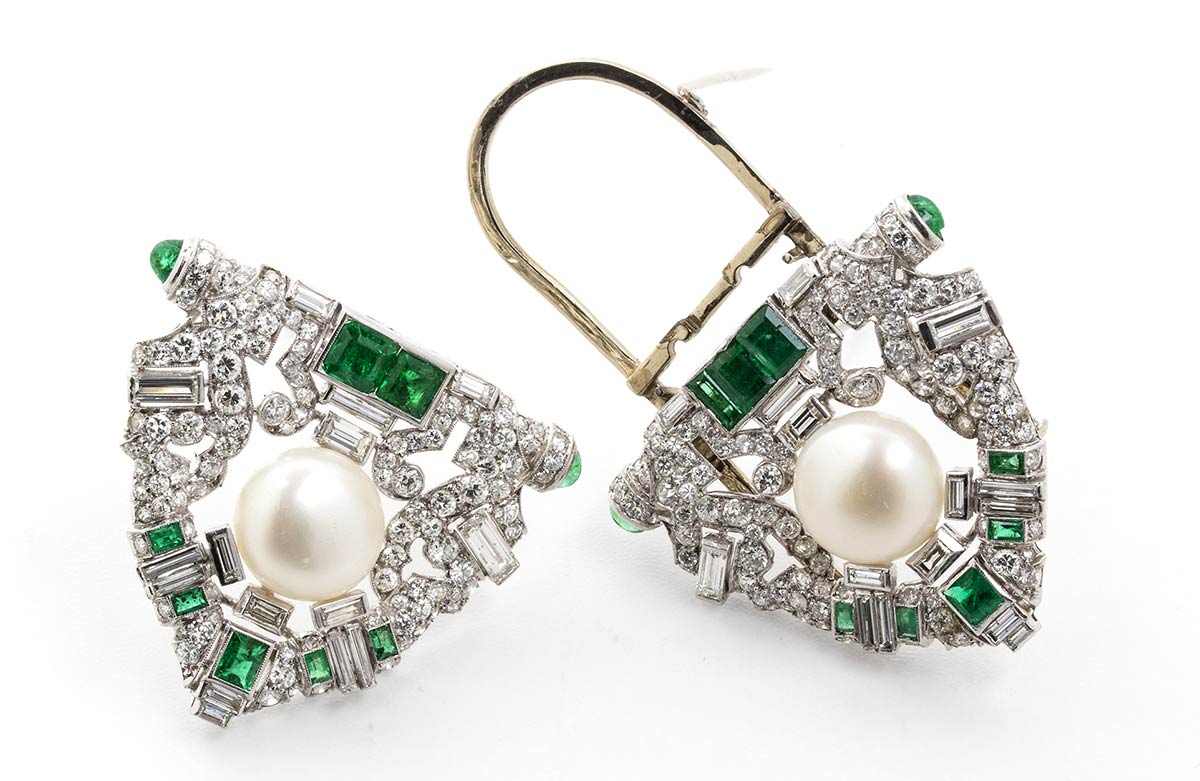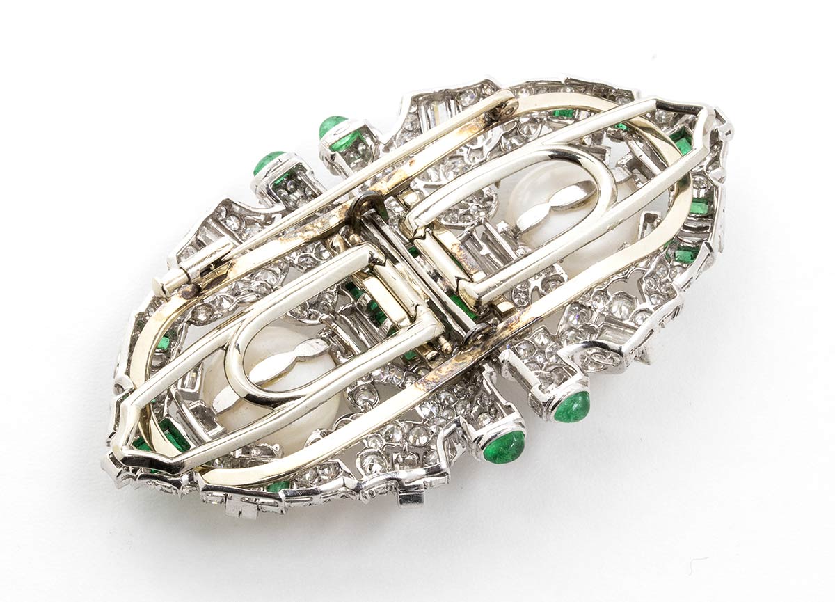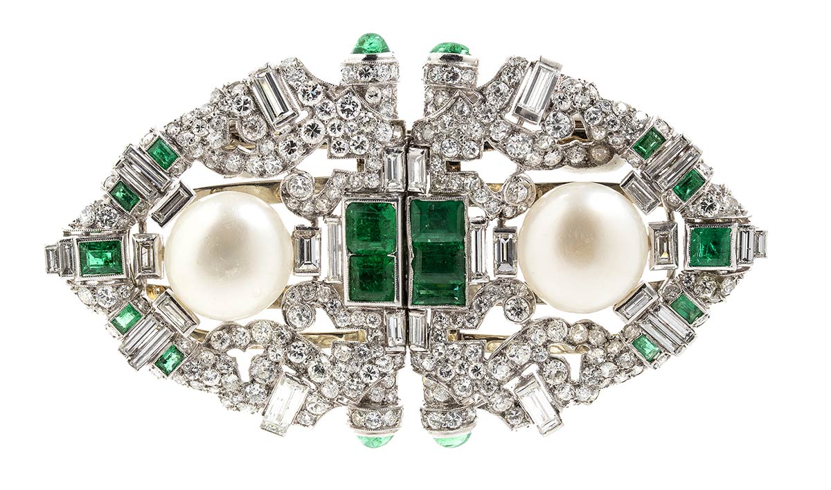 Spilla "duette" con diamanti, smeraldi e perle