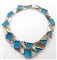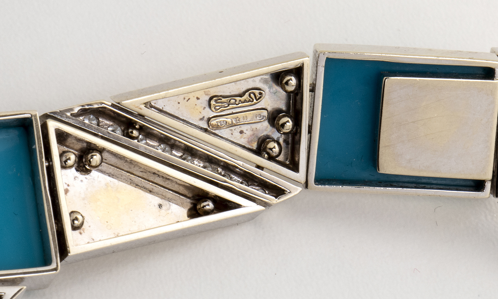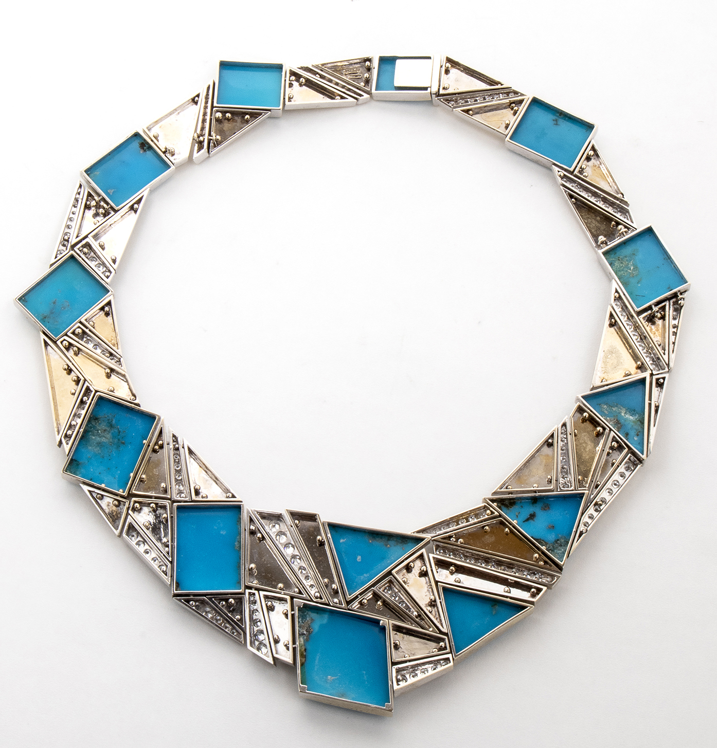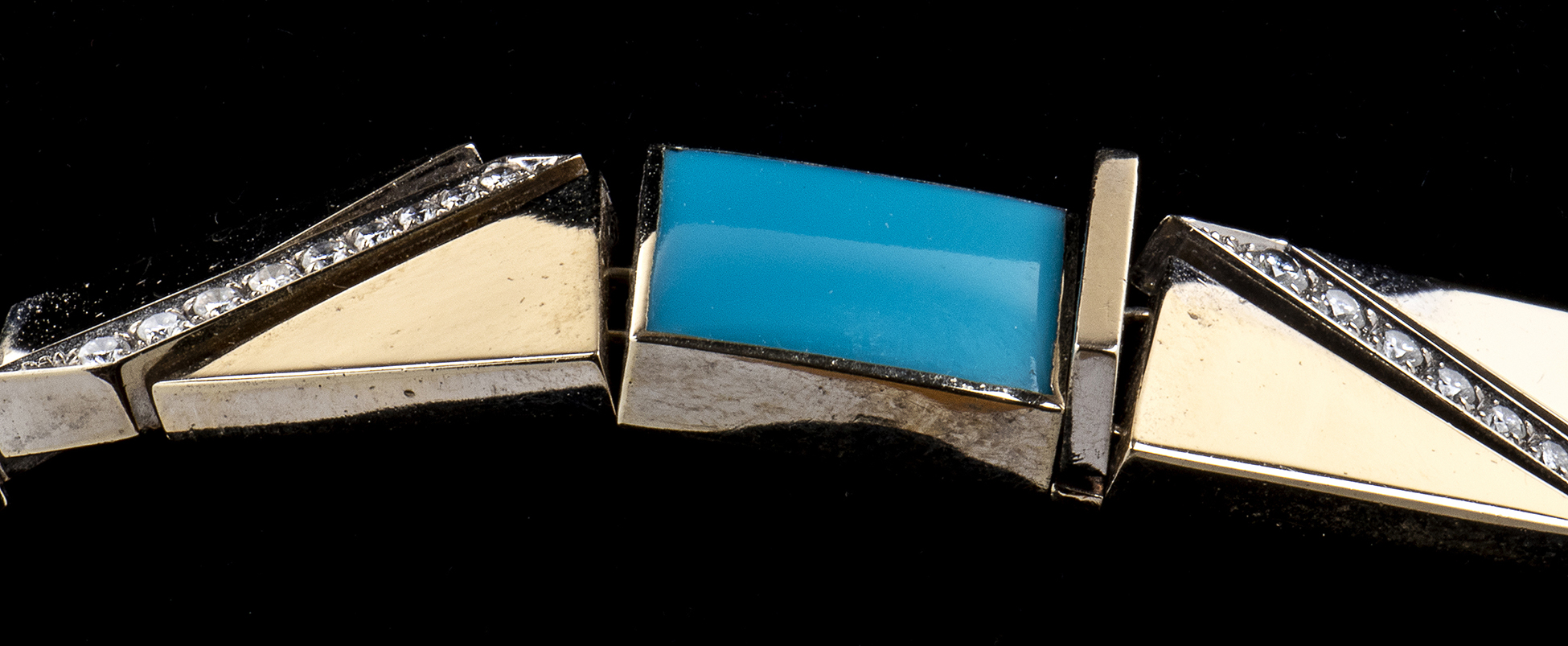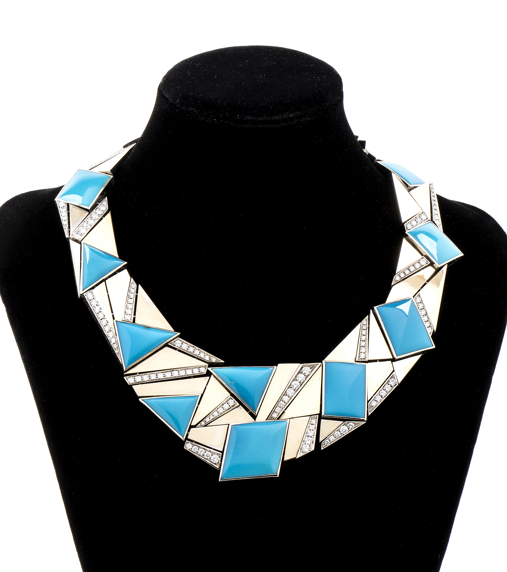 realizzata in oro bianco 18k, modello semirigido con inserti geometrici di turchese, incastonata con diamanti di forma rotonda taglio brillante 9,50 ct ca., F-G, VVS. Peso 186 gr. Lunghezza 40 cm. Larghezza da 12 a 50 mm. Stato di conservazione: ***** ottimo.