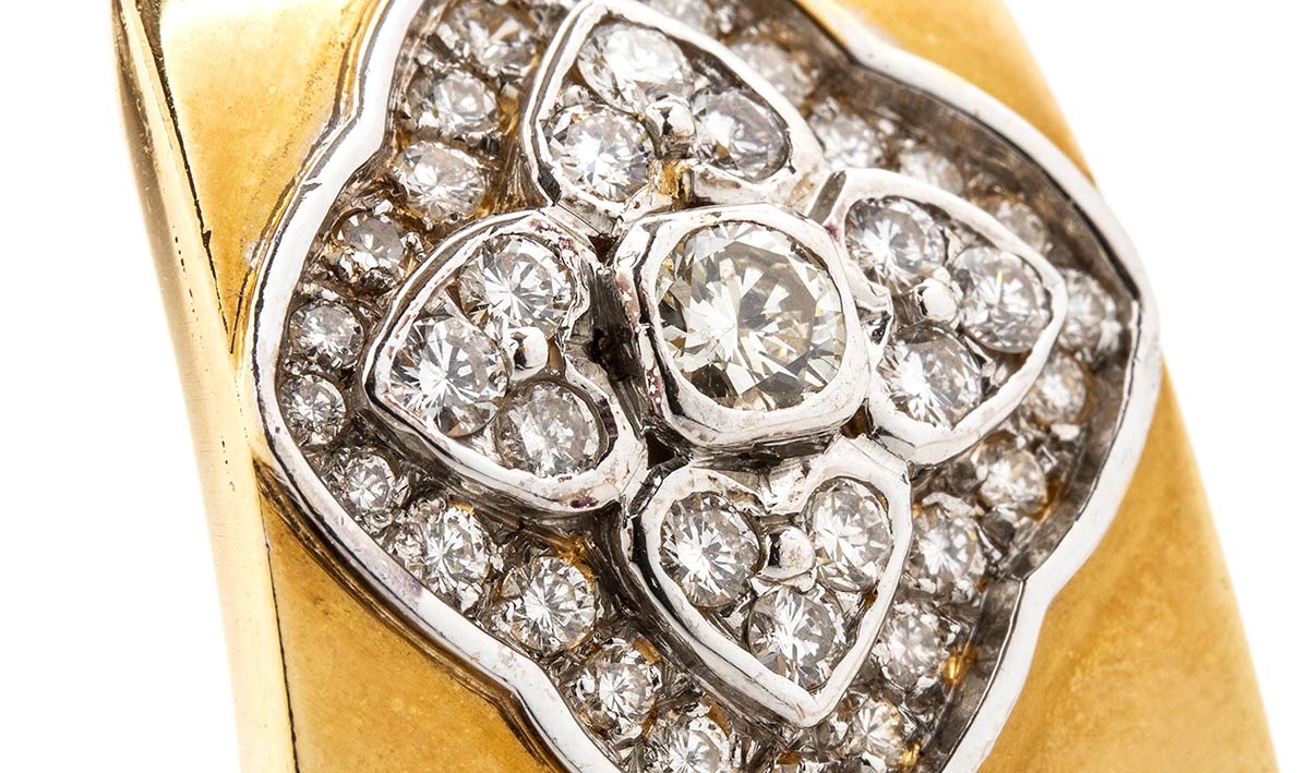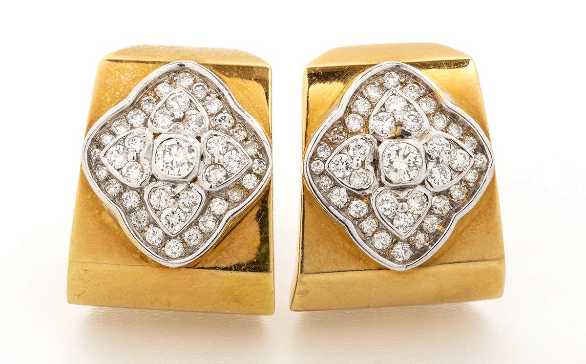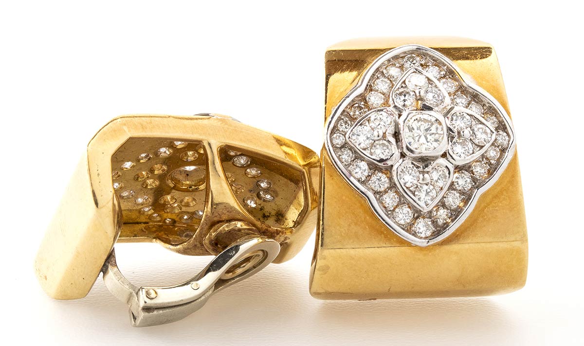 realizzati in oro giallo 18k, incastonati con diamanti di forma rotonda, taglio brillante 3,00 ct ca., H-I, VS. Dimensioni 27 x 21 mm. Peso 35,2 gr. Stato di conservazione: ***** ottimo.