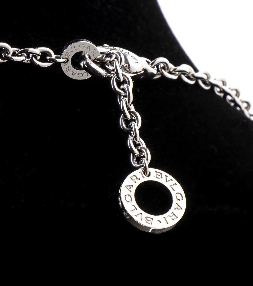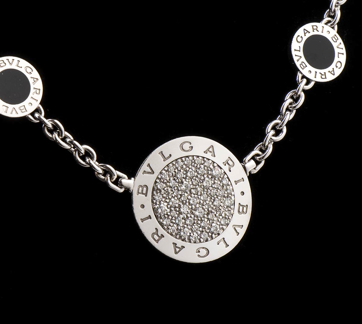 realizzato in oro bianco, collezione Bvlgari-Bvlgari, 3 dischi incastonati con pavé di damanti contornati dal logo Bvlgari-Bvlgari e 3 dischi reversibili incastonati con onice e contornati dal logo Bvlgari-Bvlgari. Diamanti rotondi, taglio brillante 3,50 ct ca., F-G, VVS. Manifattura Bvlgari. Firmato "Bvlgari". Punzonato "750", "1498 AR" e "Made in Italy". Lughezza 48 cm. Peso 38,4 gr. Stato di conservazione: ***** ottimo.