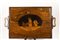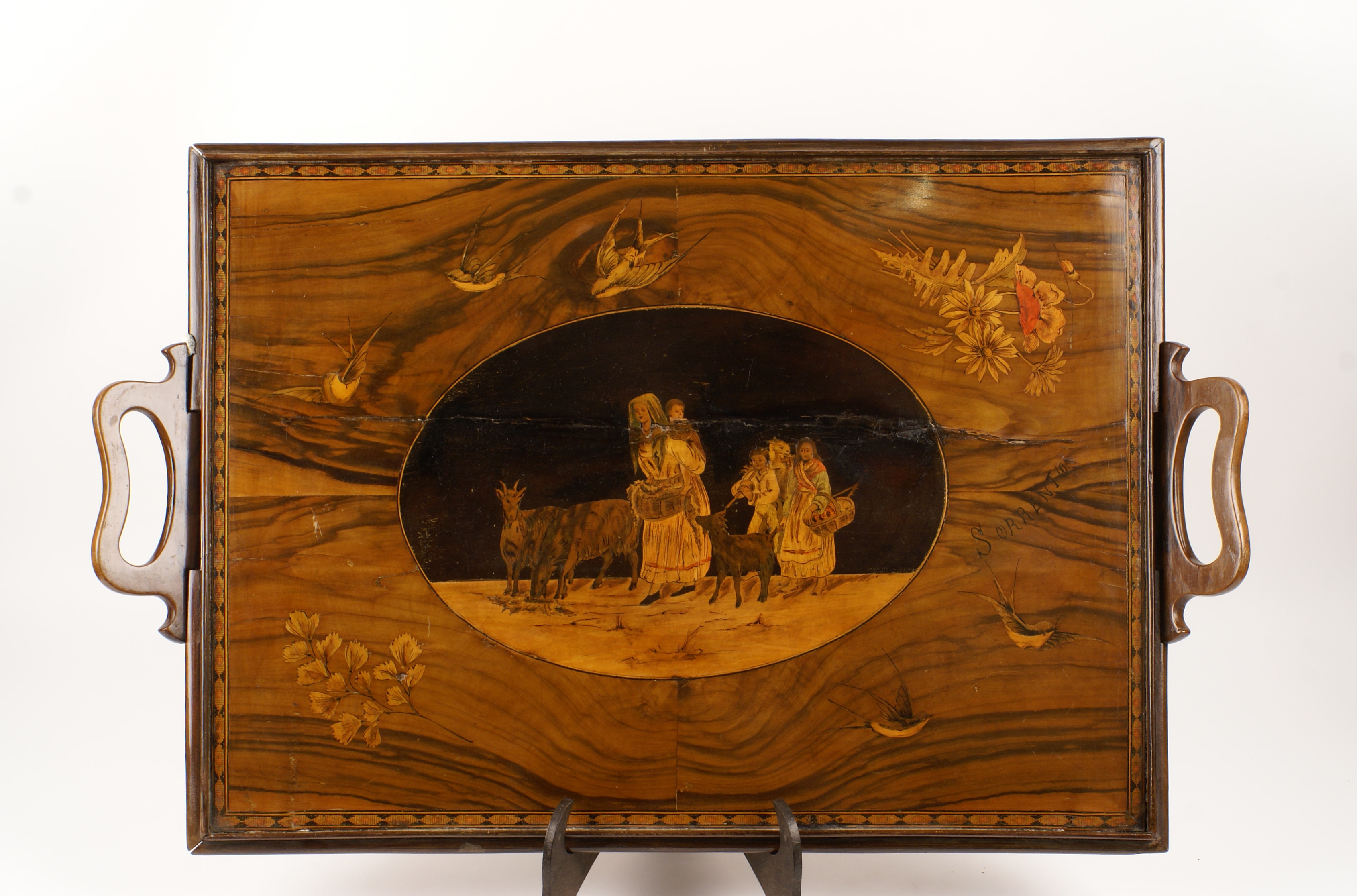 VASSOIO SORRENTINO IN NOCE XIX Sec. di forma rettangolare a due manici, intarsiato in legni di frutto vari su entrambi i lati 74x45 cm.