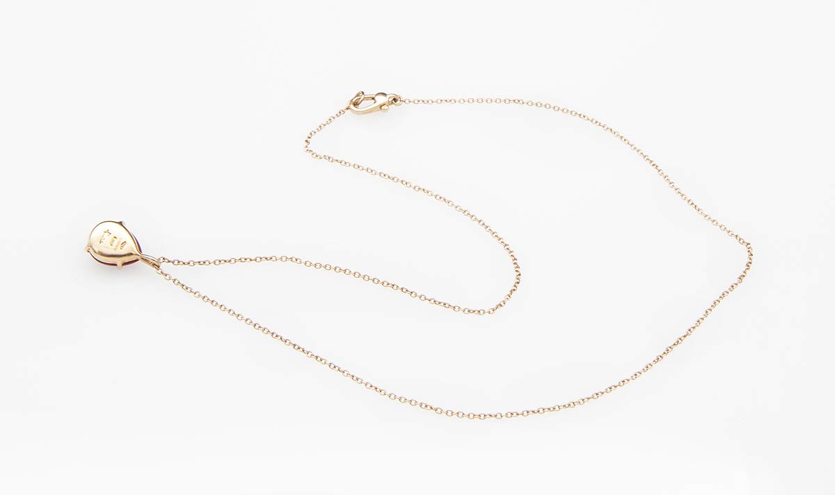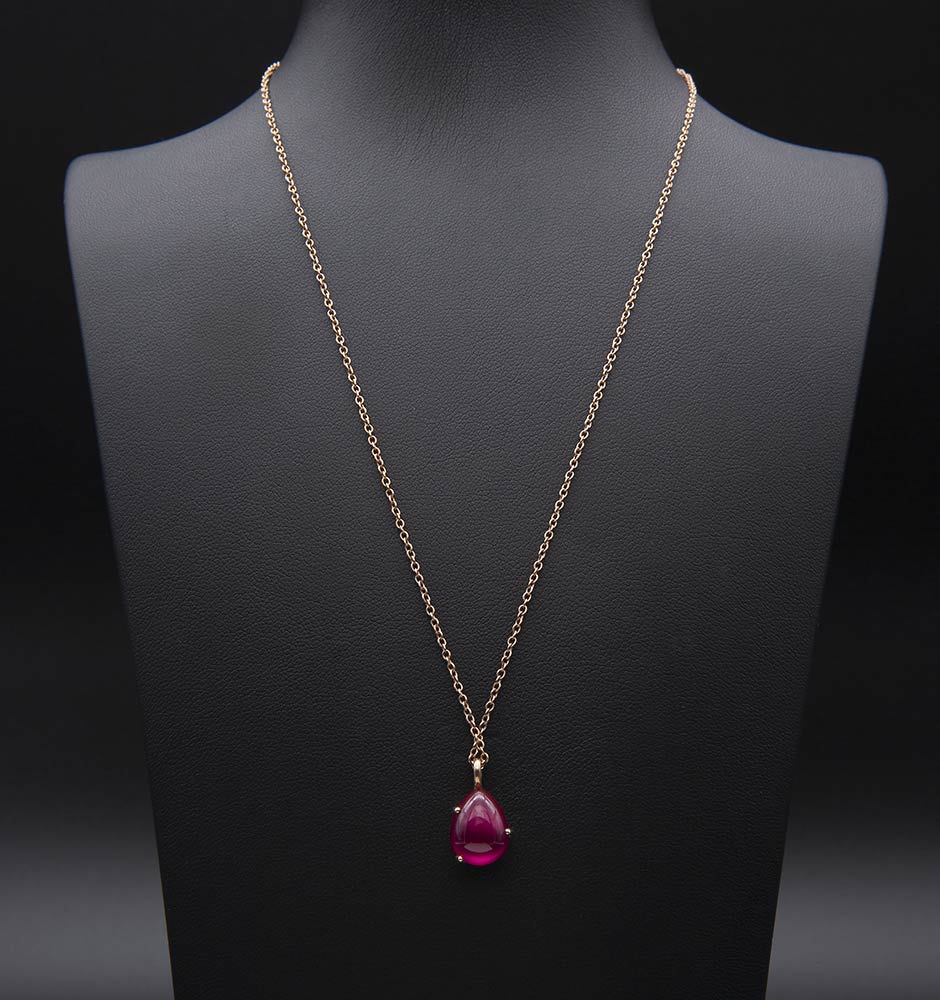 Collana in oro rosa 9k con rubino sintetico cabochon realizzata da POMELLATO MILANO, collezione "Rouge Passion". Punzonata "375 - 1484 MI - 170008102". Lunghezza 41 cm. Peso 3,5 gr. Stato di conservazione: ***** ottimo.