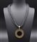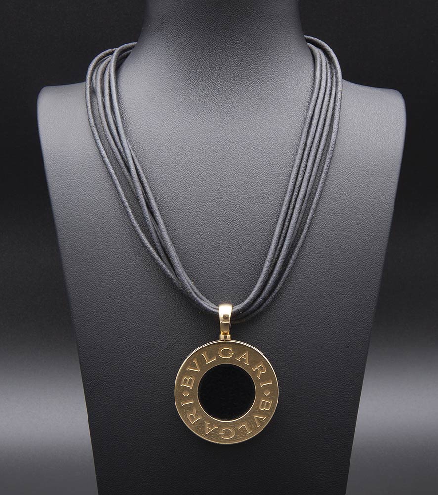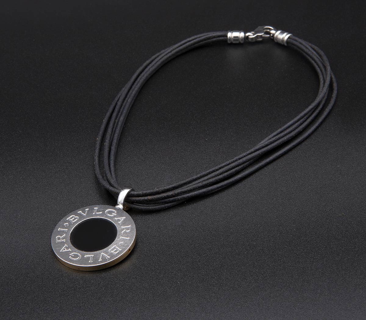 5 fili in cuoio e fermezza in acciaio, a cui é sospeso un pendente a doppia faccia in acciaio e oro giallo 18k con onice. Collezione "Bvlgari-Bvlgari". Manifattura "Bvlgari". Punzonato "750", "2391 AL" e "BULGARI-Made in Italy- gold and Steel ". Diametro pendente 35 mm. Lunghezza collana 48,5 cm. Peso 31,3 gr. Stato di conservazione: ***** ottimo.