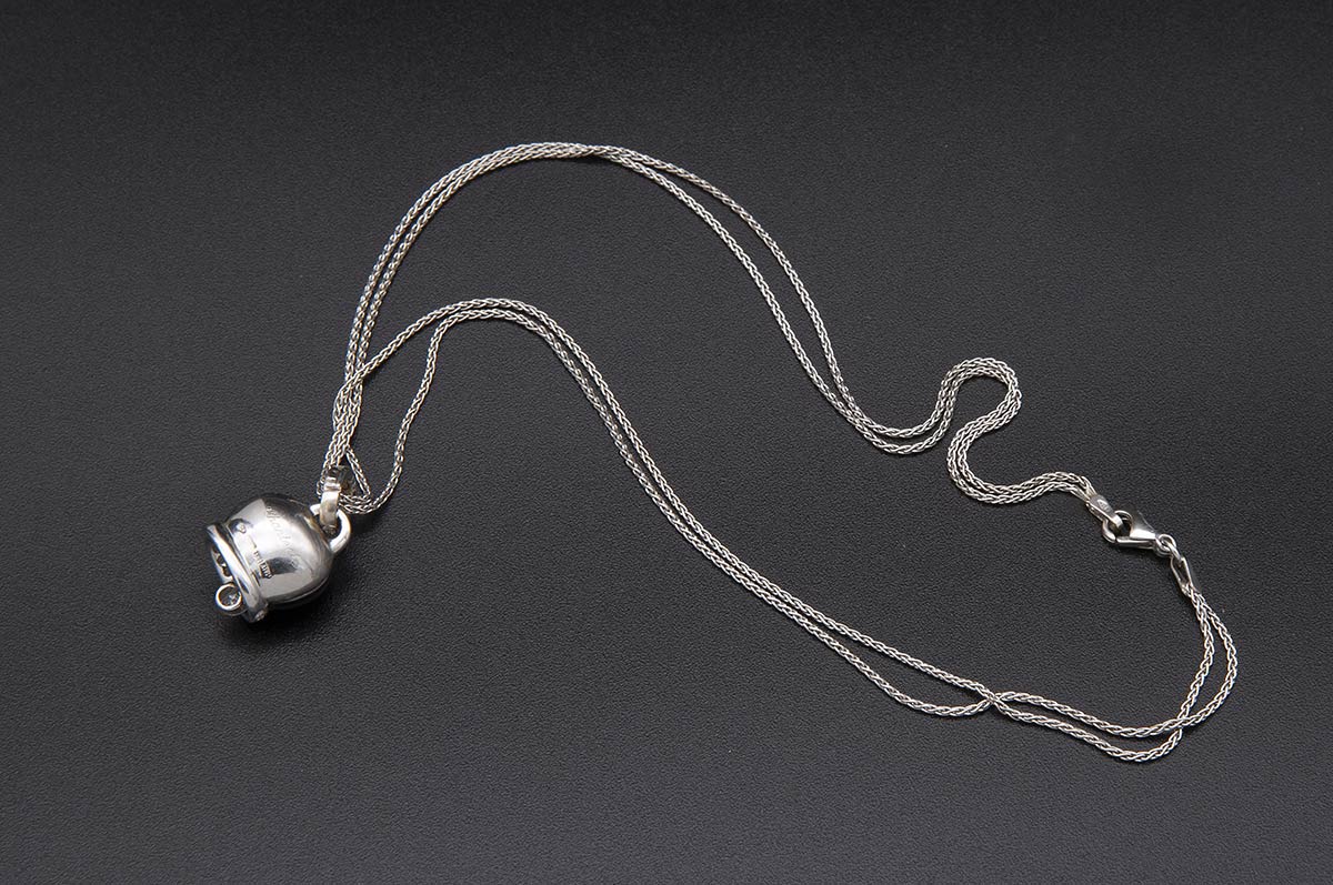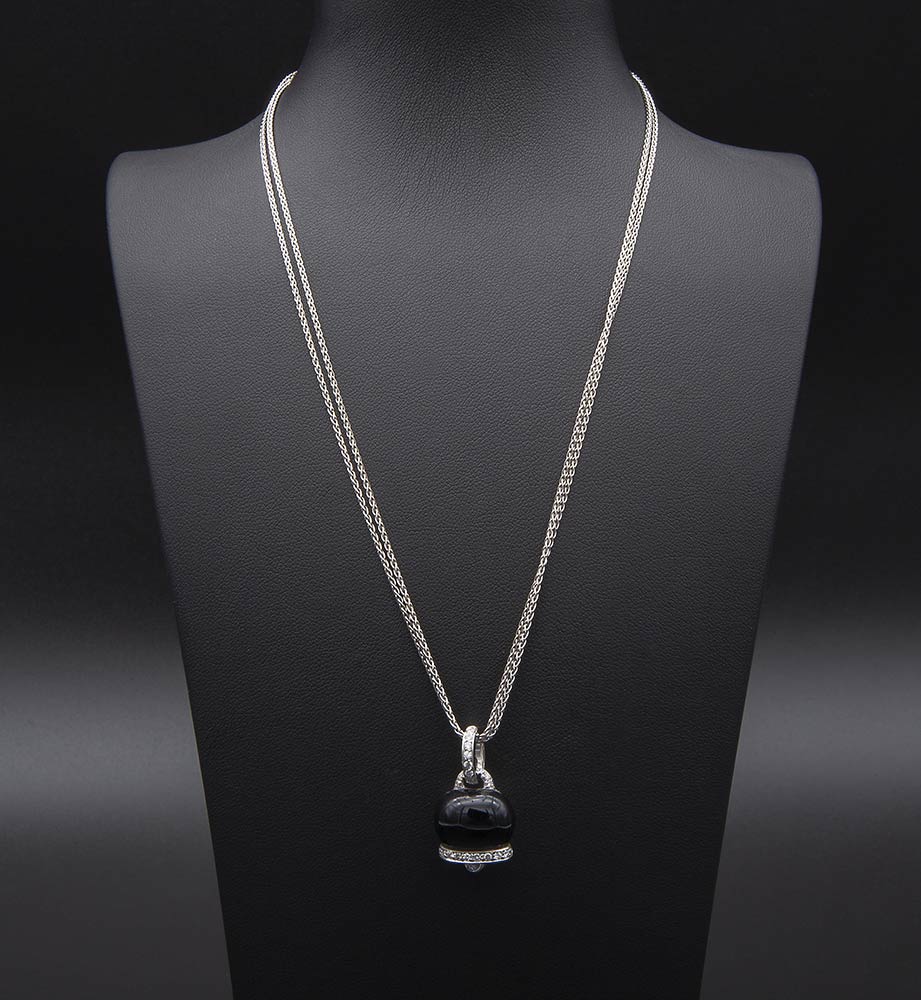 campanella in oro bianco 18k con smalto nero, diamanti 0,50 ct ca., F, VVS. Firmata "Chantecler Capri". Punzonato "750", "2037 AL", "Italy 18k e "Chantecler". Dimensioni 22 x 14 mm. Peso 5,3 gr (catenina dimostrativa esclusa). Stato di conservazione: ***** ottimo.
