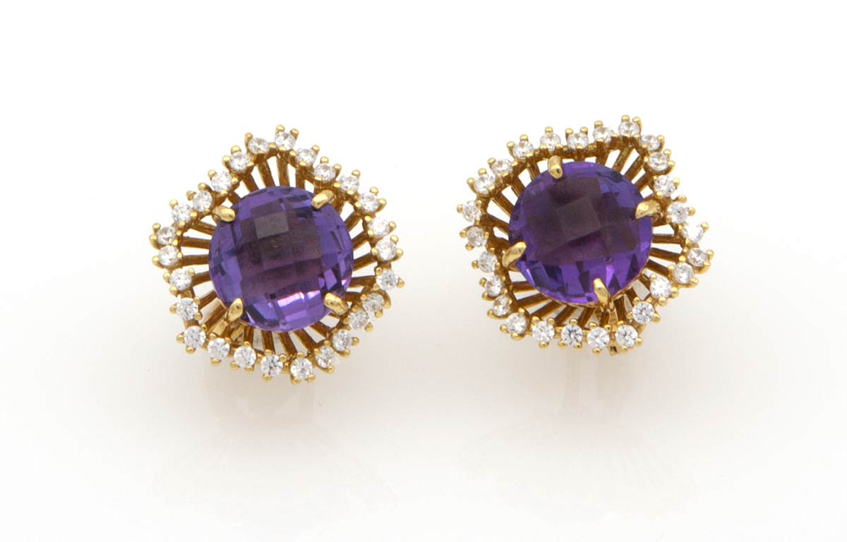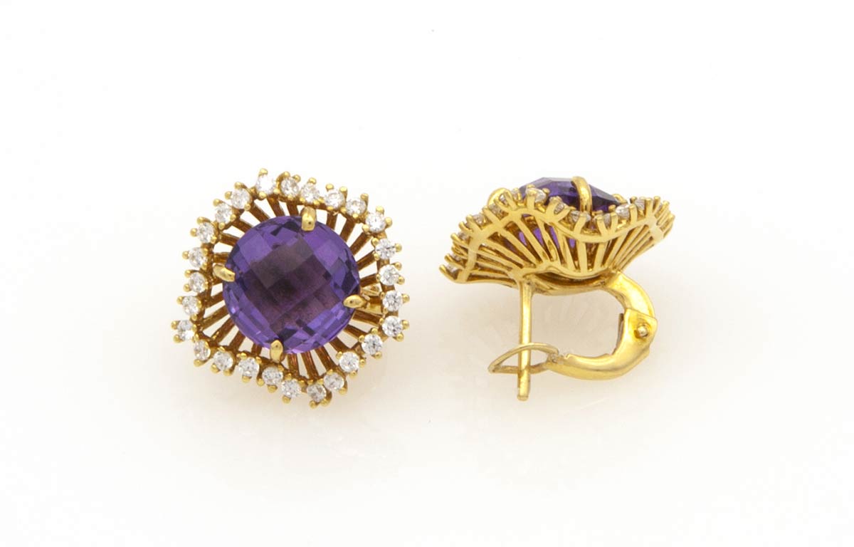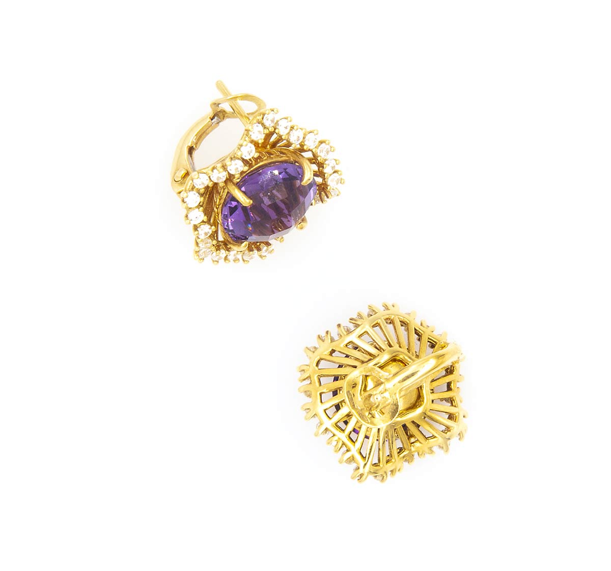 in oro giallo 18k con diamanti e ametista. Diamanti taglio brillante 0,80 ct ca., H, VVS. Punzonati "750" e "2965 Al". Dimensioni 24 x 22 mm. Peso 8,8 gr. Stato di conservazione: ***** ottimo.