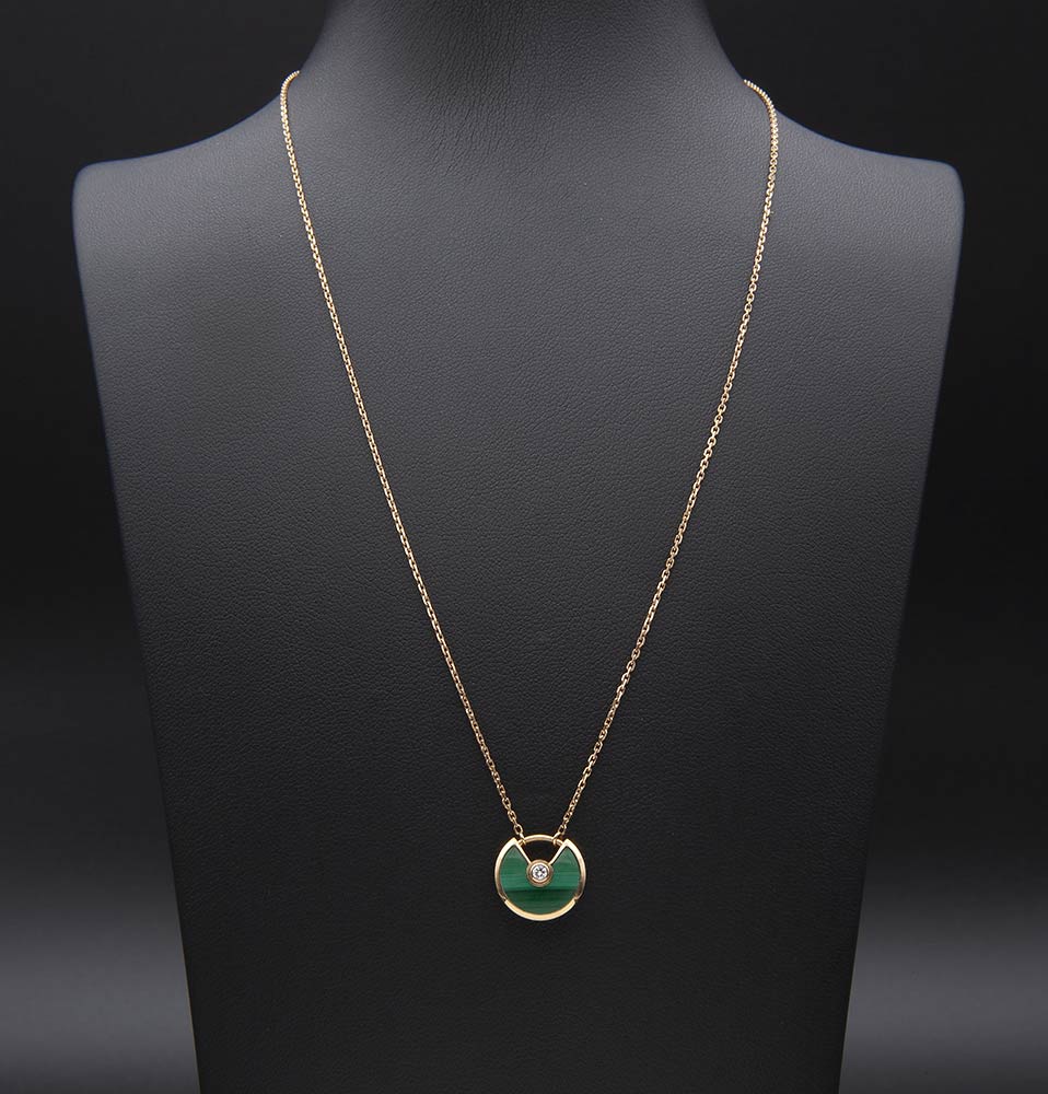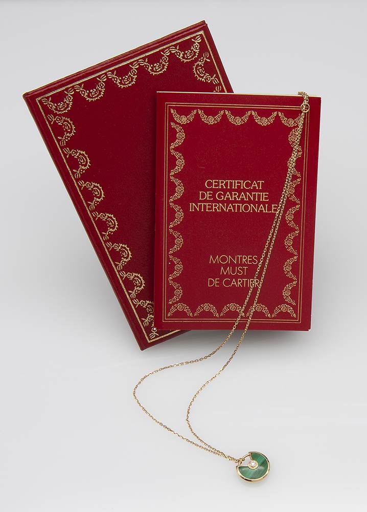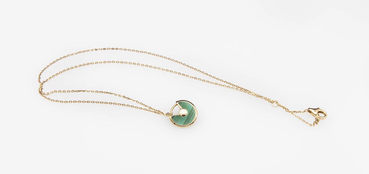 in oro giallo 18k con malachite e diamante taglio brillante 0,02 ct ca., F, VVS. Manifattura "Cartier", modello "Amulette". Diametro pendente 12 mm. Lunghezza regolabile 38 - 41 cm. Punzonato "CARTIER", "AU 750" e "FHN270". Peso 3,2 gr. Stato di conservazione: ***** ottimo.
