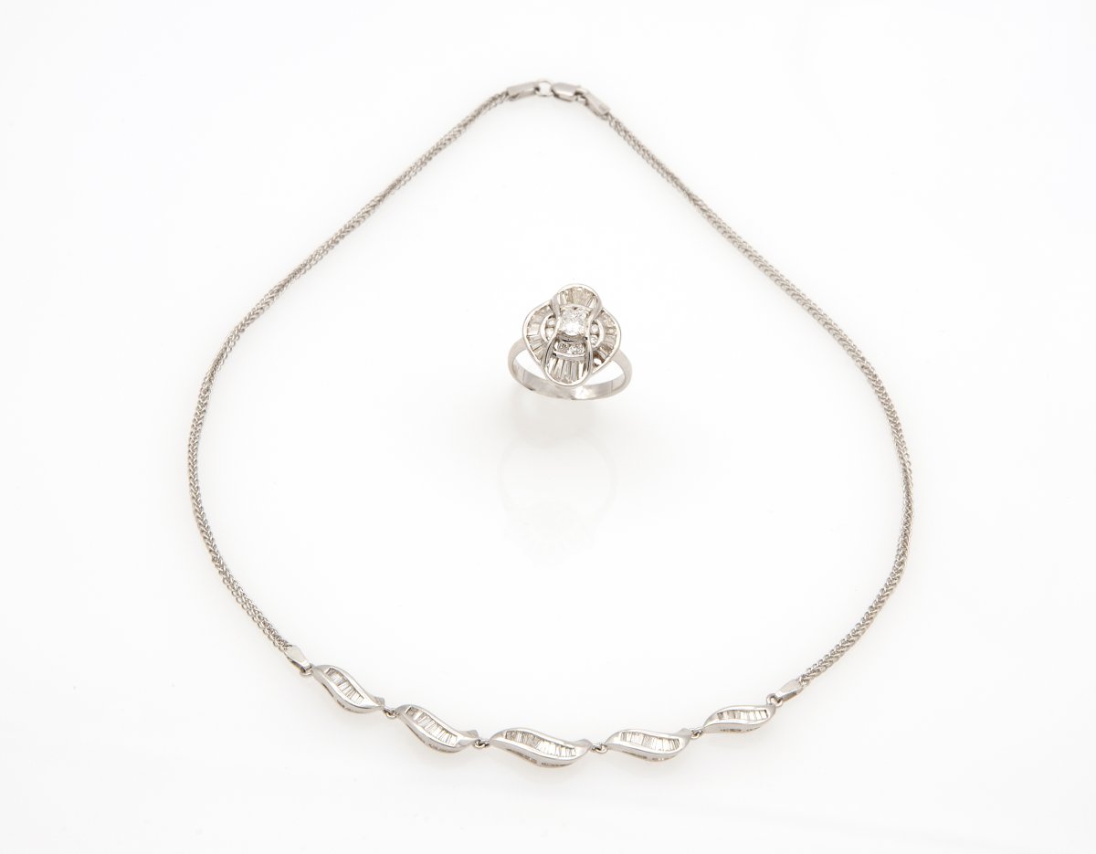 in oro bianco 14k con diamanti taglio carré, taglio brillante e tapered 2,85 ct ca., G-H, VS-SI. Dimensioni anello 14,7 x 14,4 mm. Lunghezza collana 37 cm. Punzonato "14 k". Peso 11,6 g. Stato di conservazione: ***** ottimo.