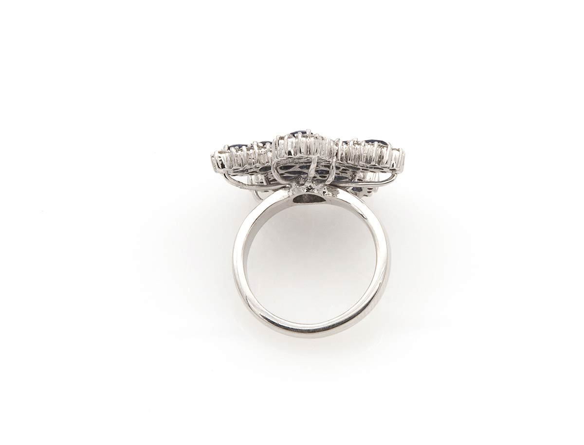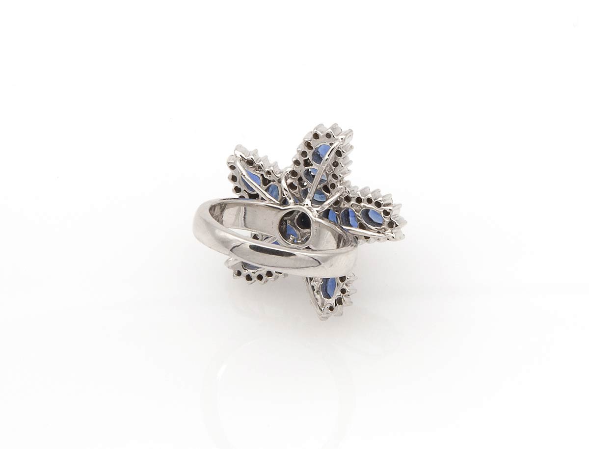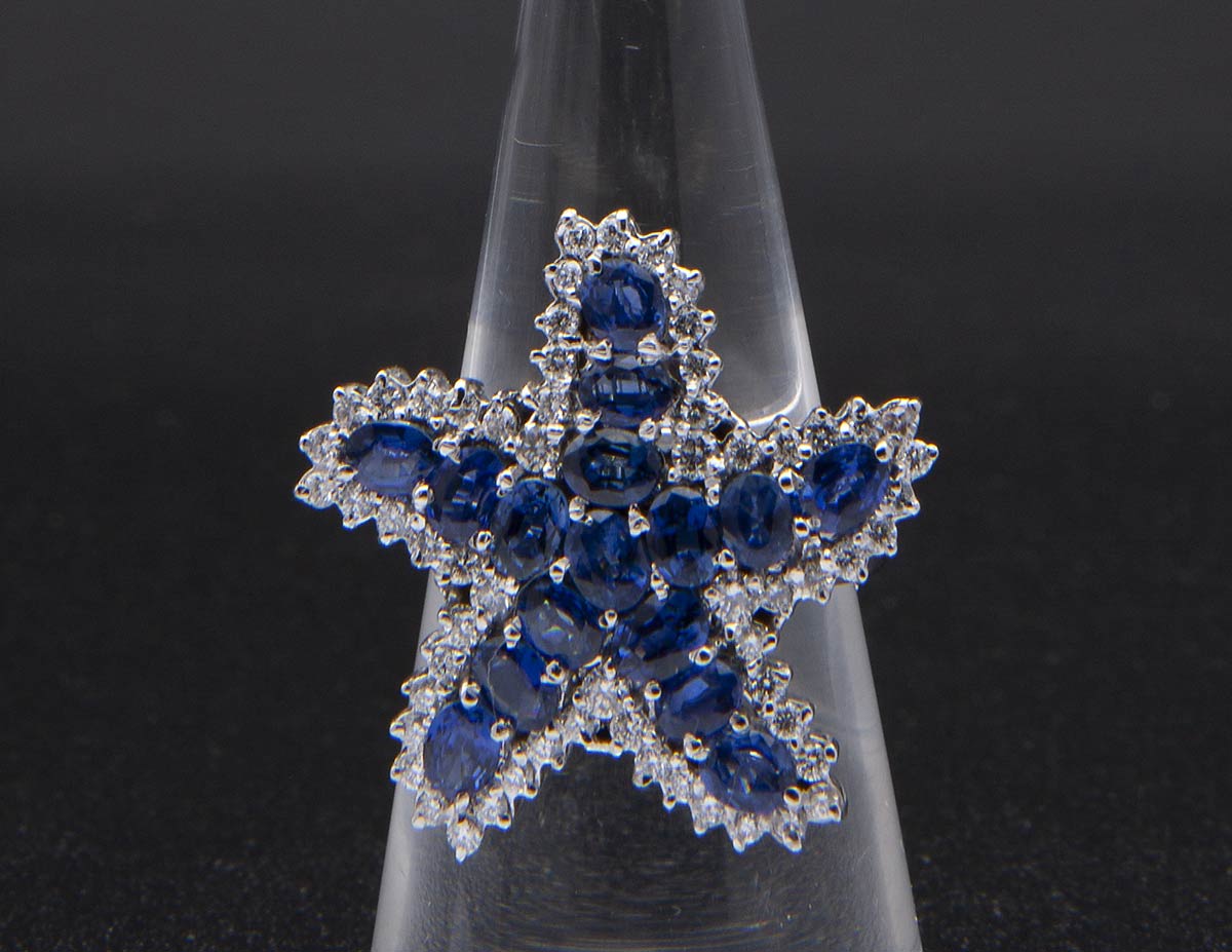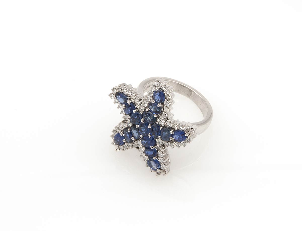 in oro bianco 18k, a forma di stella incastonato con zaffiri e diamanti taglio brillante. Zaffiri 3,50 ct ca. Diamanti 1,35 ct ca., F-G, VVS-VS. Diametro 27 mm. Punzonato "750". Misura IT 15 - US 7. Peso 14,1 gr. Stato di conservazione: ***** ottimo.