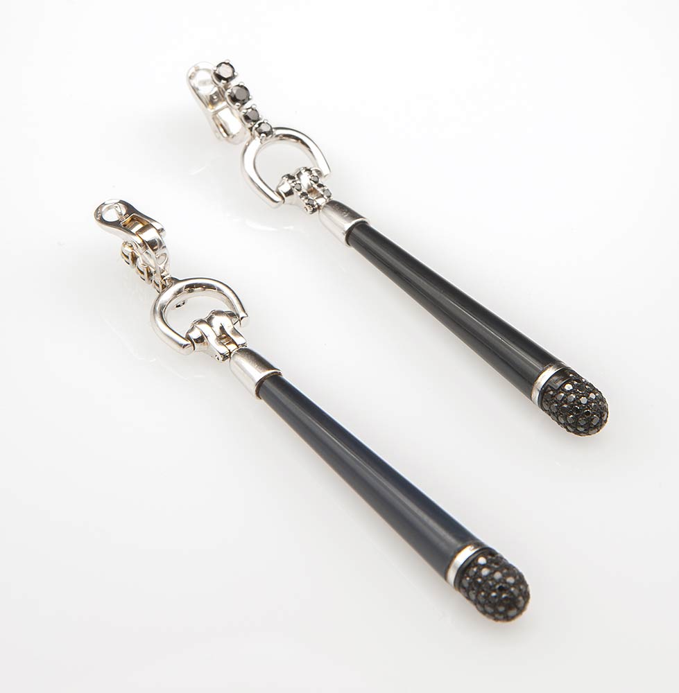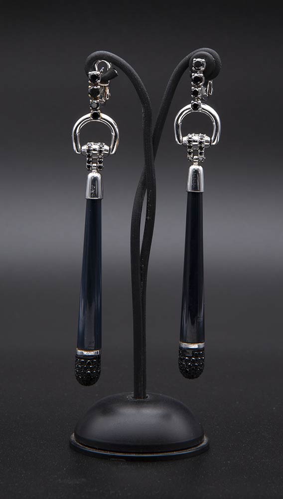 in oro bianco 18k con diamanti neri taglio brillante e materiale sintetico. Diamanti 1,90 ct ca. Firmati "Gucci". Punzonati "AU 750", "1695 MI" e "GUCCI - Made in Italy". Dimensioni 80 mm. Peso 18,5 gr. Stato di conservazione: ***** ottimo.