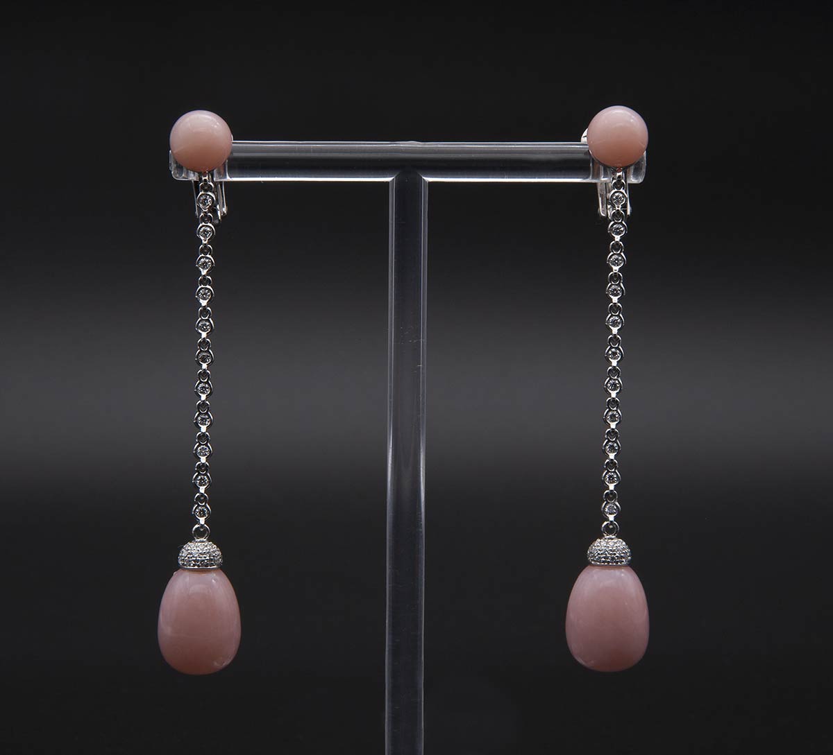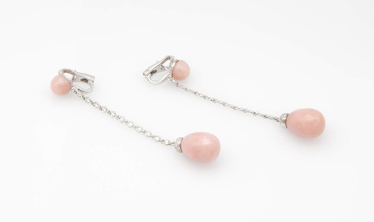 in oro bianco 18k con diamanti taglio brillante e opale rosa. Diamanti 0,75 ct ca., F, VVS. Punzonato "750", "1059 NA", "18 kt" e "Chantecler". Lunghezza 75 mm. Peso 12,4 gr. Stato di conservazione: ***** ottimo.