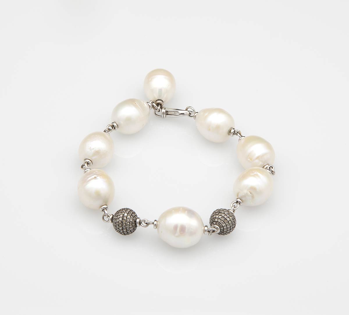 in oro bianco 18k con perle barocche e diamanti taglio brillante "brown" 2,00 ct ca. Diametro perle 13 - 16 mm. Lunghezza 18 cm. Peso 49,5 gr. Stato di conservazione: ***** ottimo.