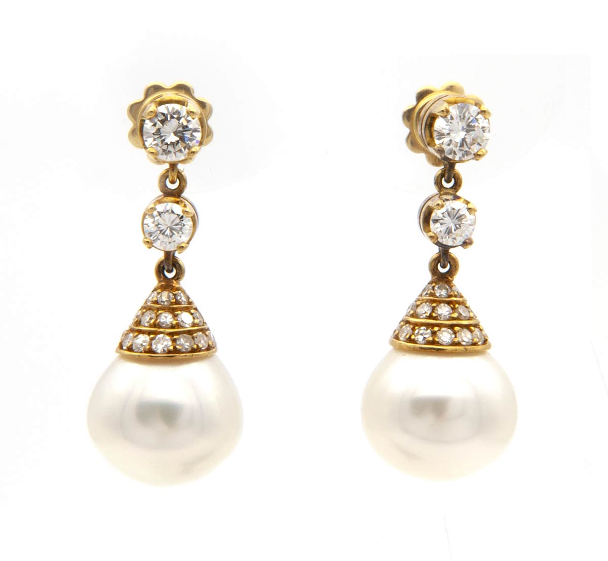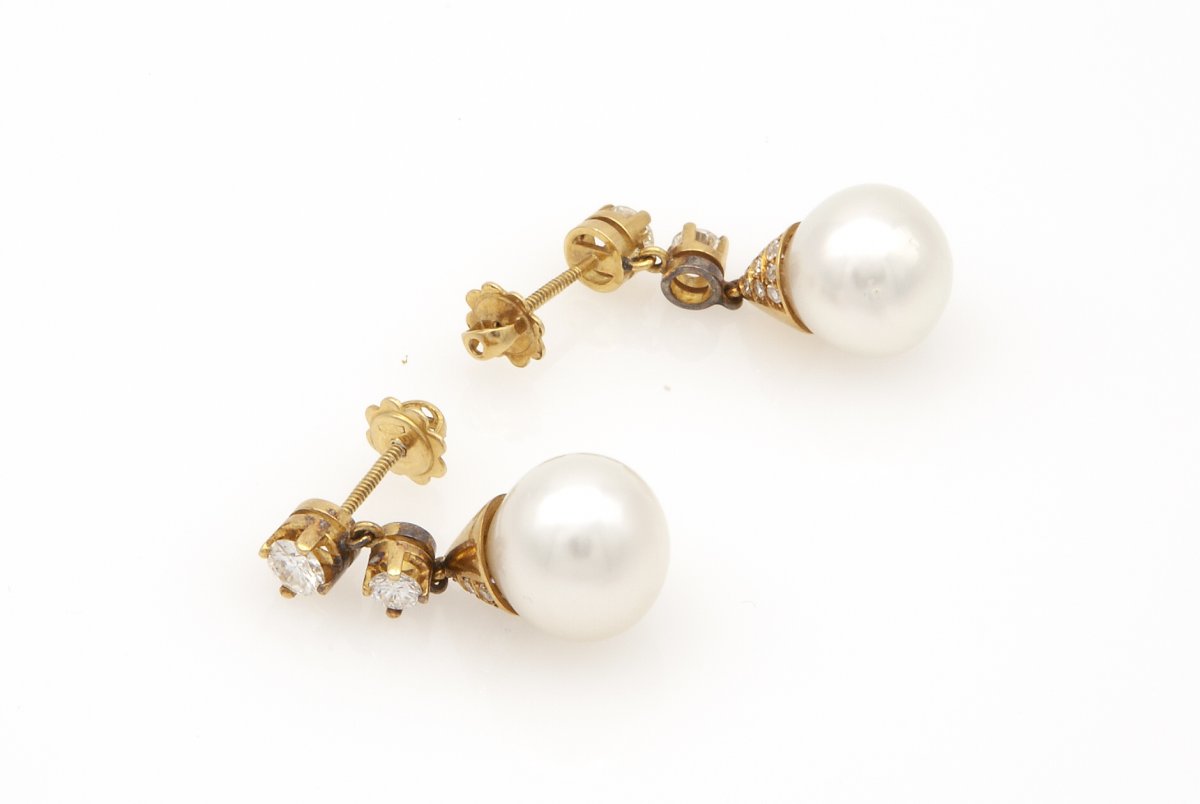 in oro giallo 18k con diamanti e perle "coltivate d'acqua salata". Diamanti taglio brillante ca. 1,10 ct., G-H, VVS-VS, pavé di diamanti taglio huit huit 0,45 ct ca. Diametro perle 12 - 12,5 mm. Lunghezza 30 mm. Peso 11,1 gr. Stato di conservazione: ***** ottimo.